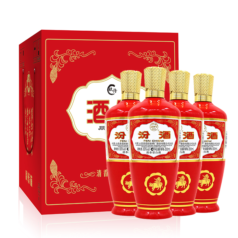 山西杏花村汾酒53度出口型红玻汾酒500mlX4高度白酒粮食酒