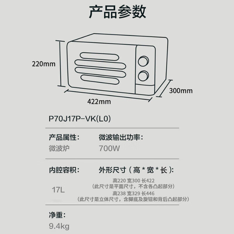 格兰仕复古微波炉17升家用700W转盘加热 旋钮操控 P70J17P-VK(L0)