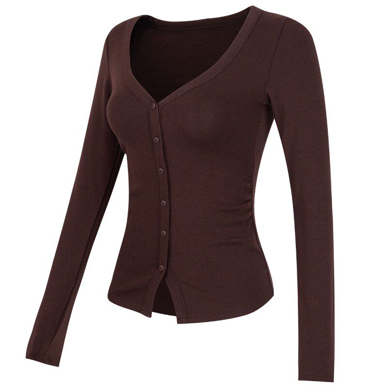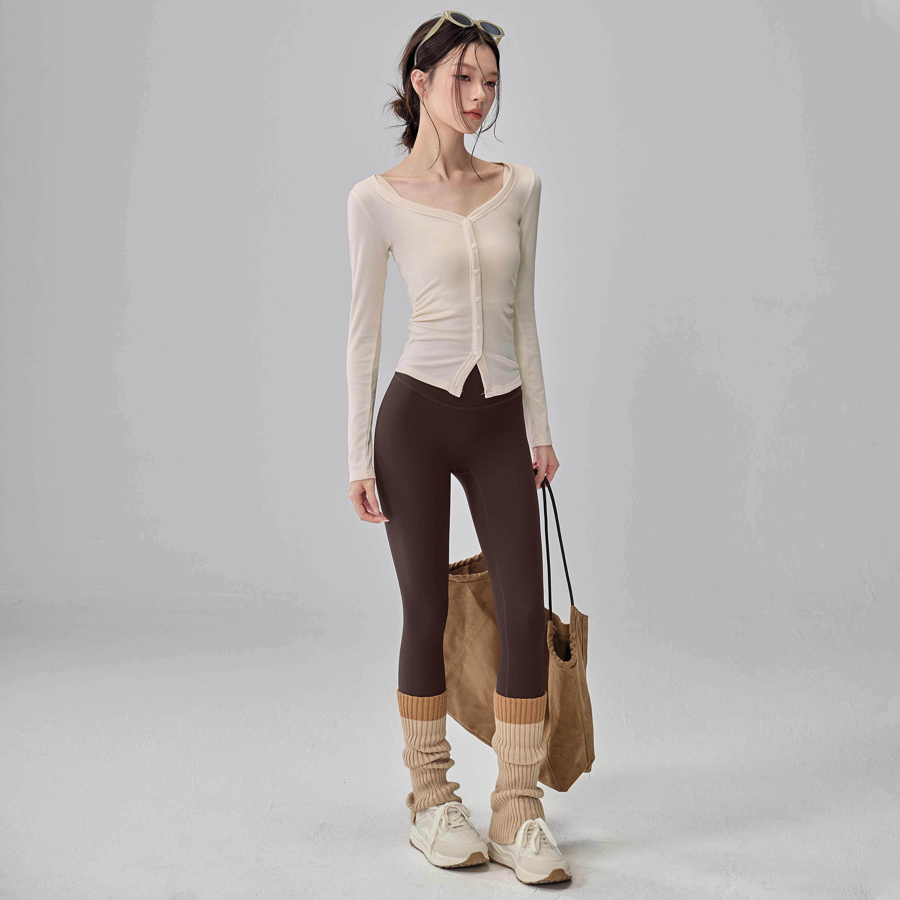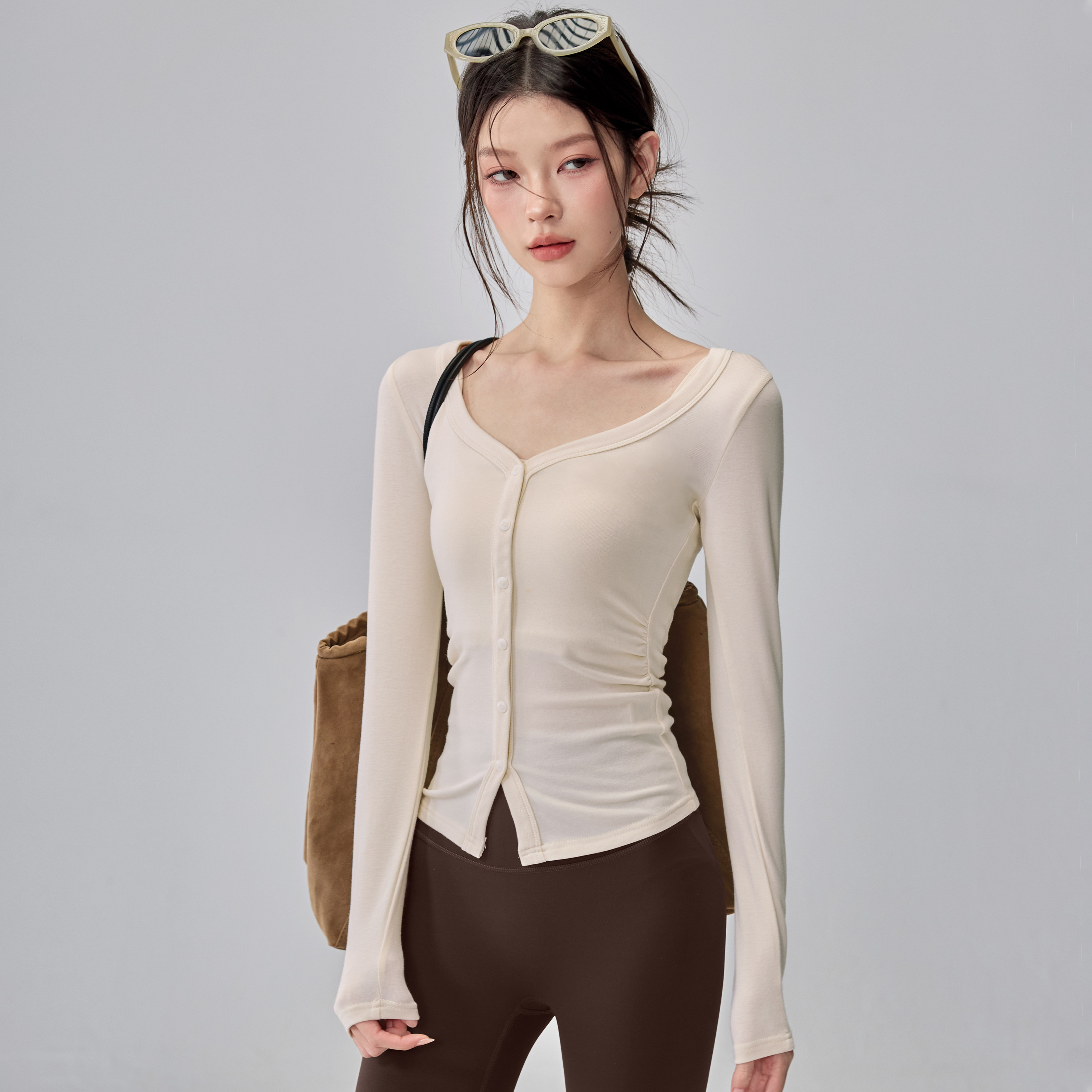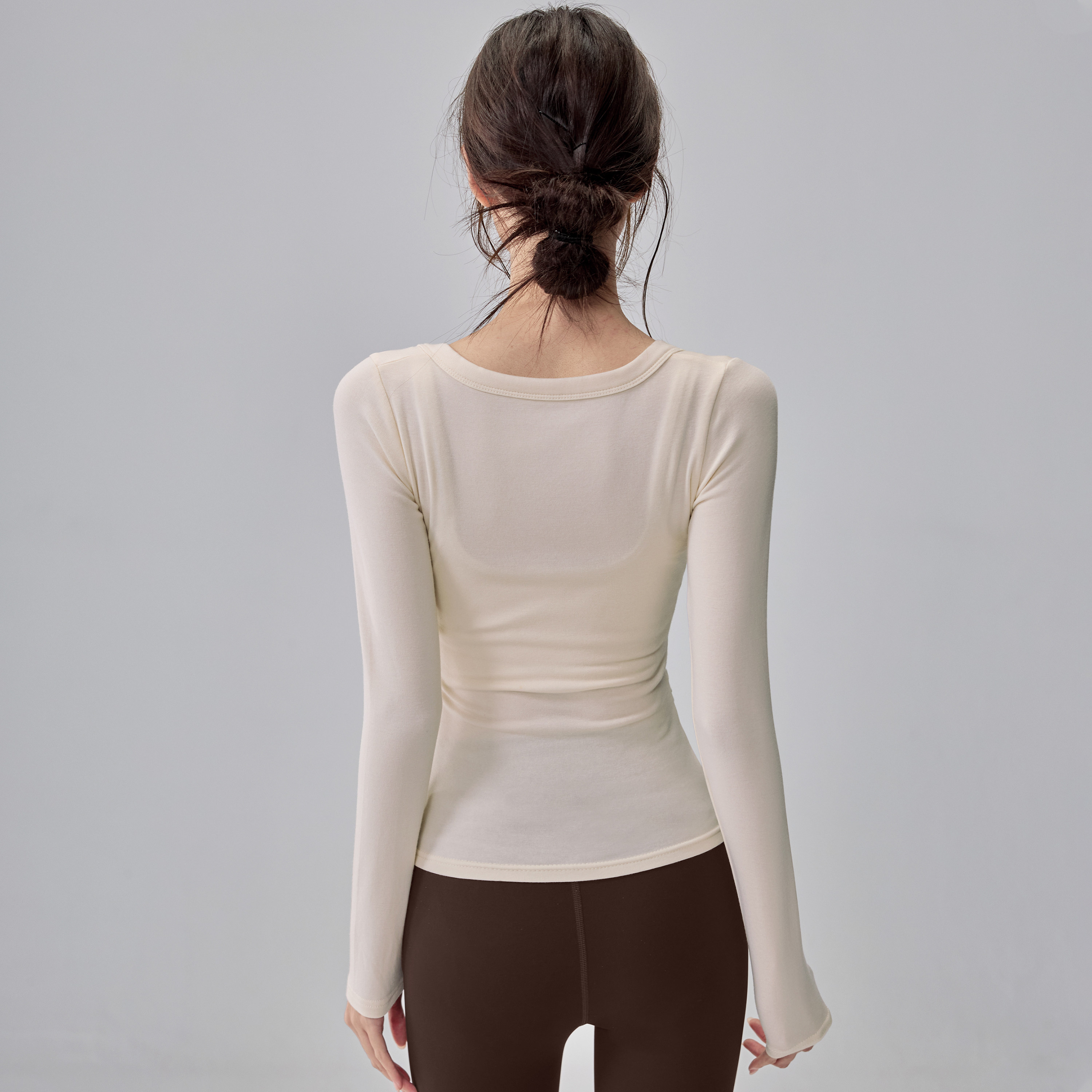 修身健身衣女绝美瑜伽服新款领排扣收腰长袖普拉提训练运动上衣秋