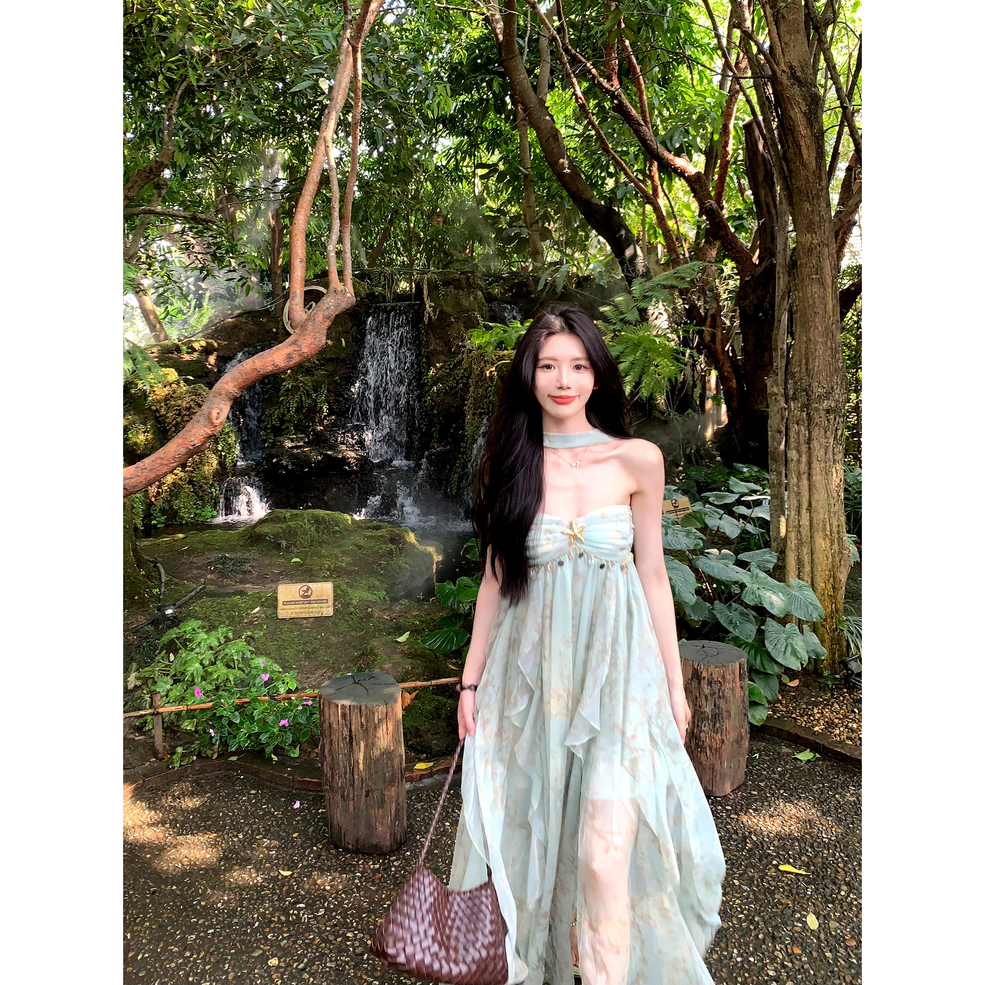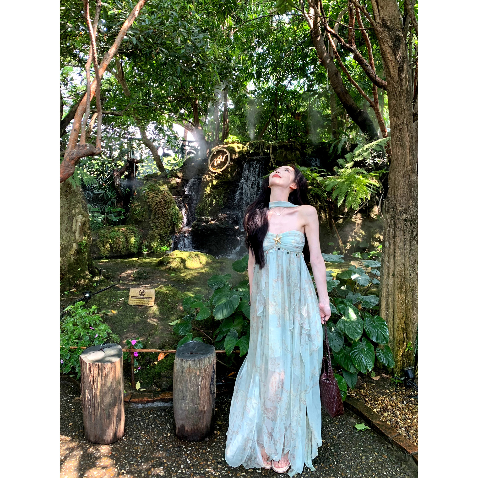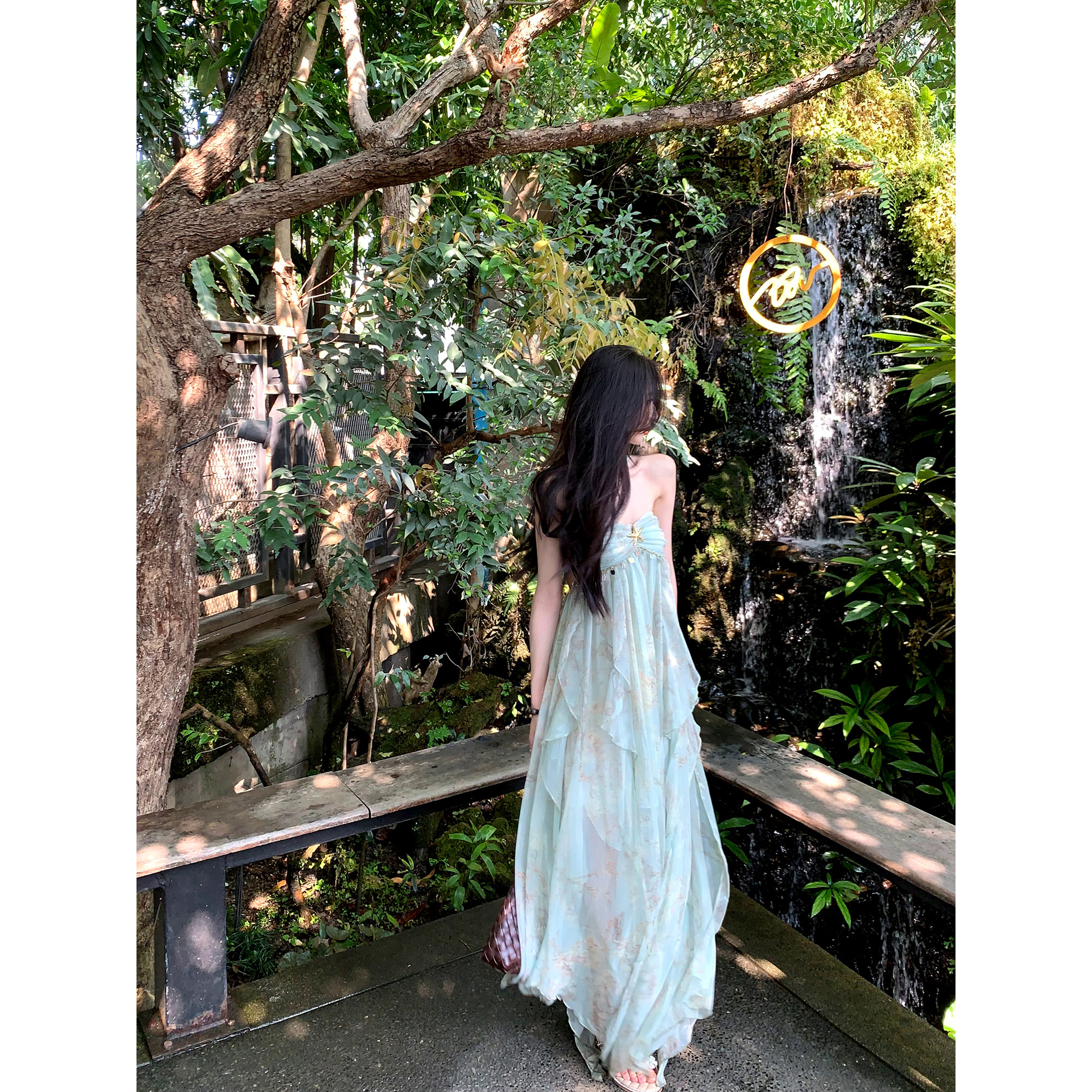 一颗甜桃yikett《清酒仲夏间》夏季抹胸度假风碎花连衣裙女连身裙