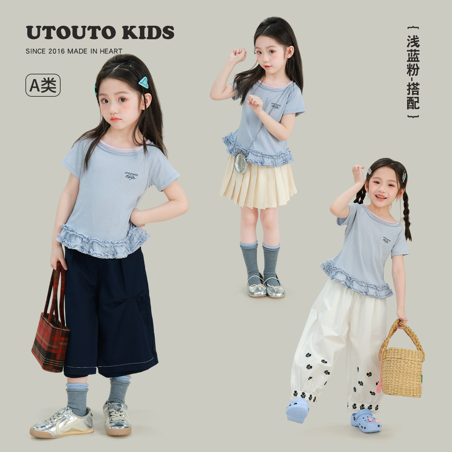 大耳象女童花边T恤2026夏季新款宝儿假两件领口甜美短款薄上衣