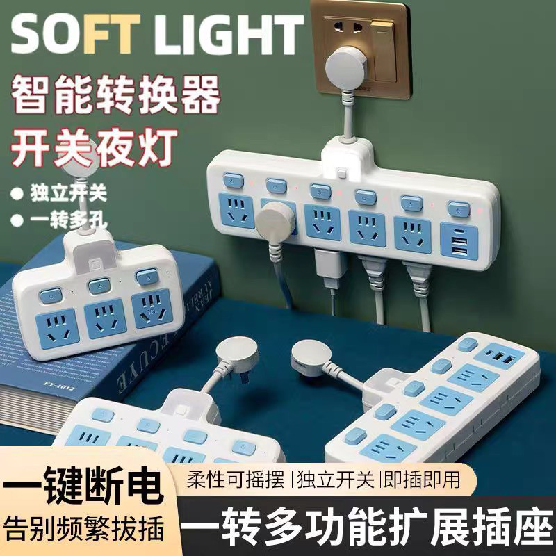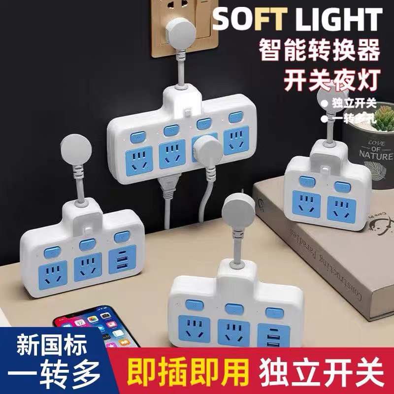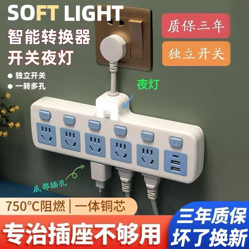 纯铜家用多功能多孔转换器夜灯USB纯铜短线插头交换器一转多插位