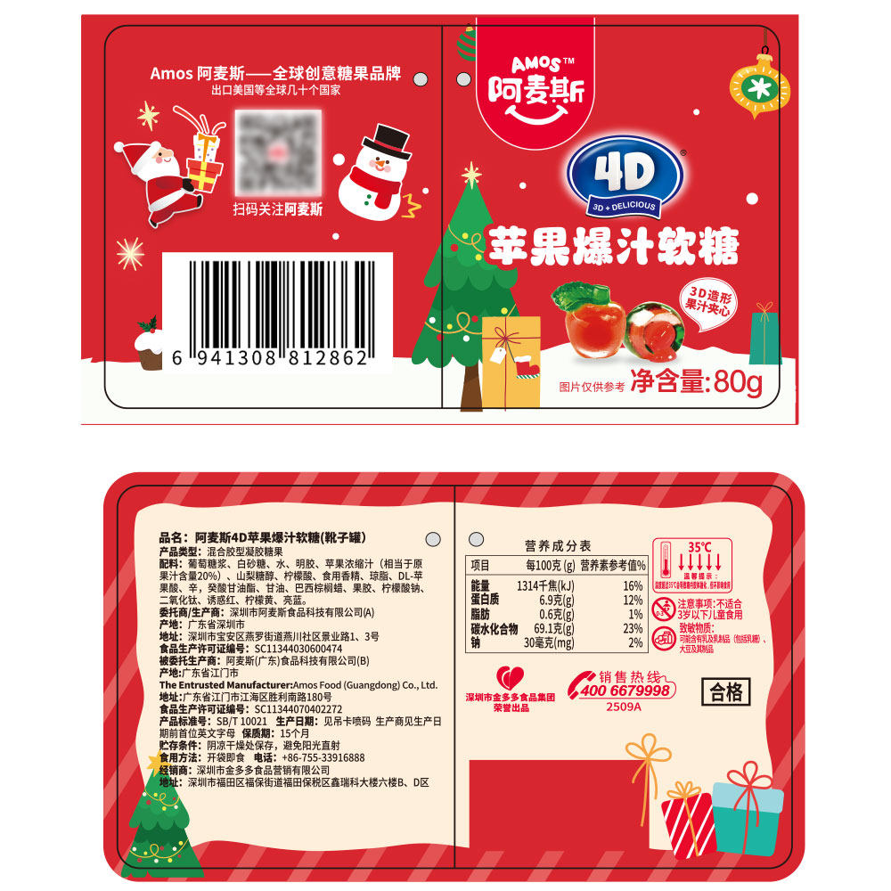 阿麦斯圣诞节靴子罐4D水果爆汁软糖平安夜儿童糖果小礼品氛围装饰