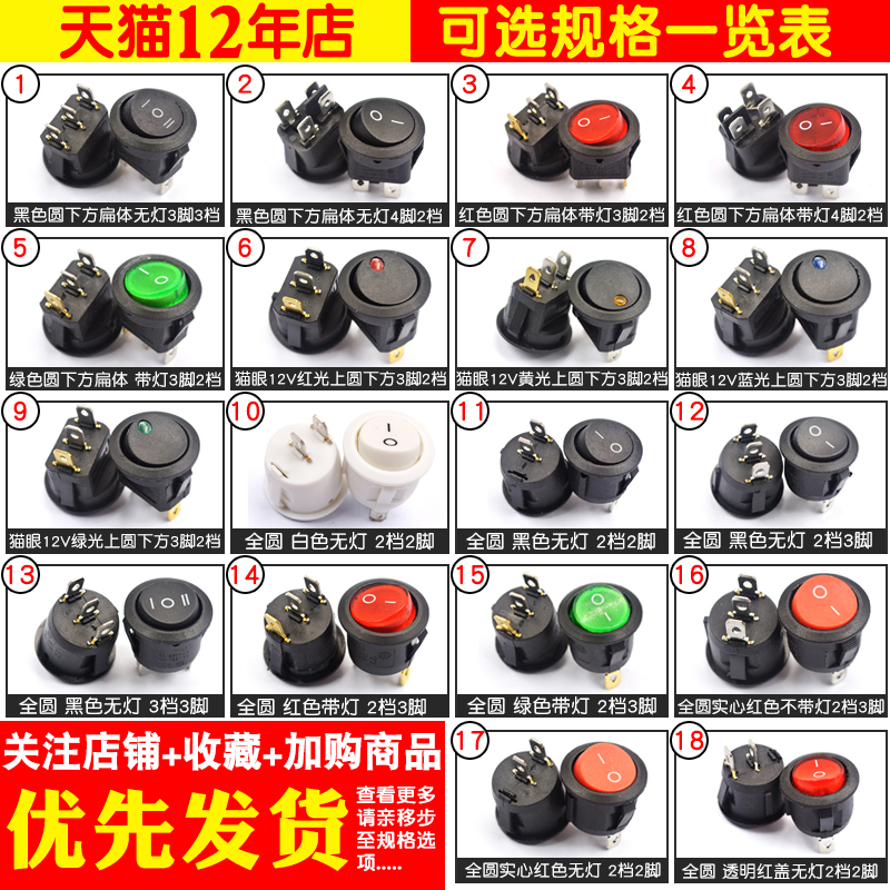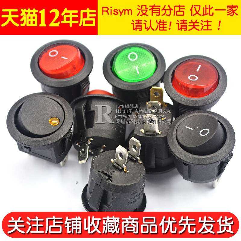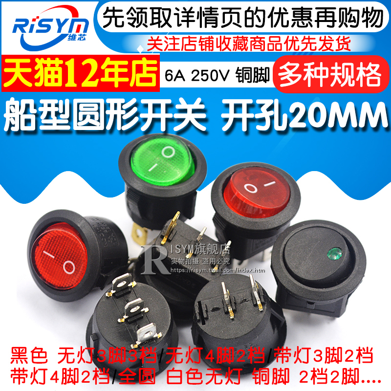 船型开关船形圆形翘板电源开关按钮2脚3红绿白黑开孔20mm6A 250V