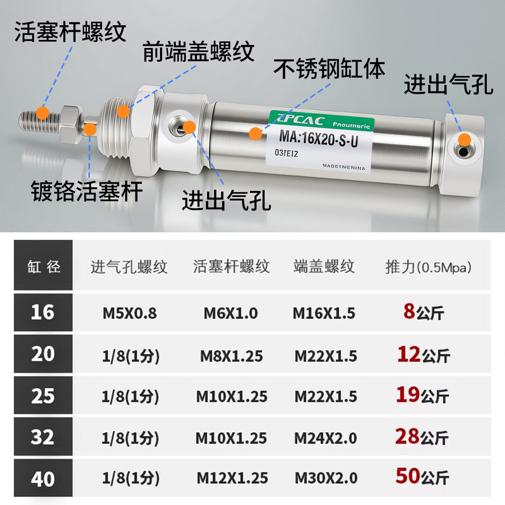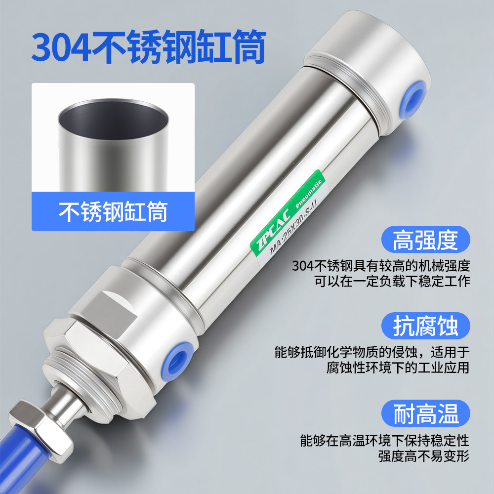 不锈钢迷你气缸气动平尾MA16/20/25-20x30X40X60*75X100X120S-U