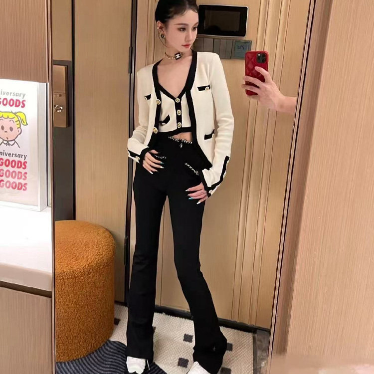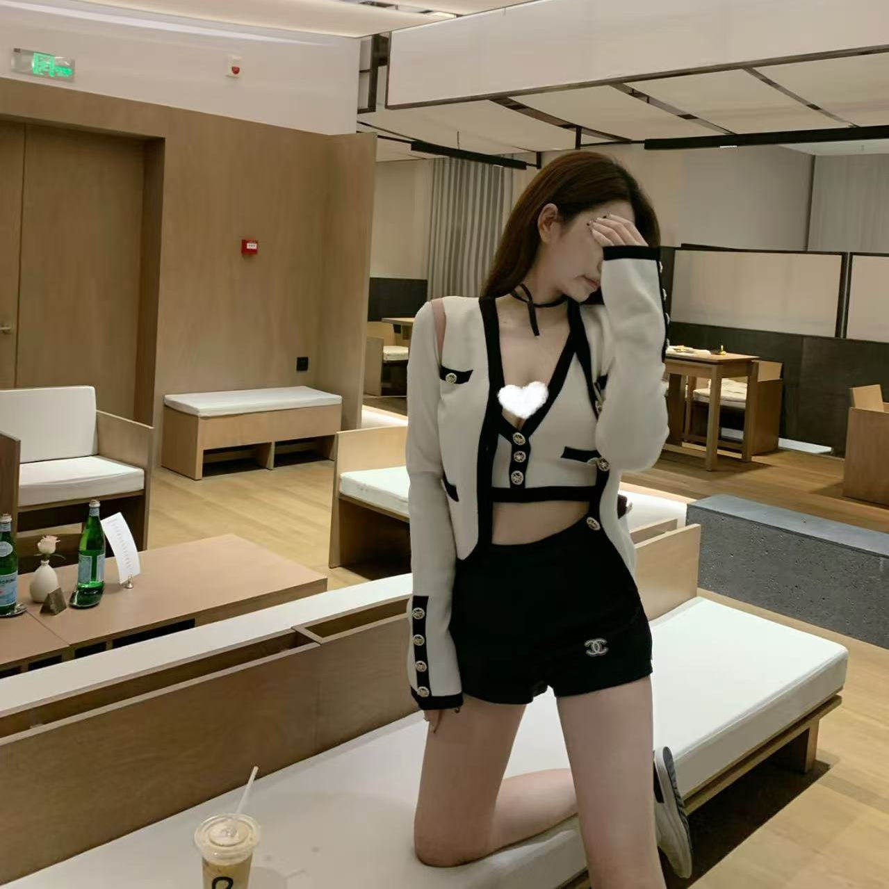 PRISCA富家千金感小香风气质名媛显瘦撞色针织背心短裙外套三件套