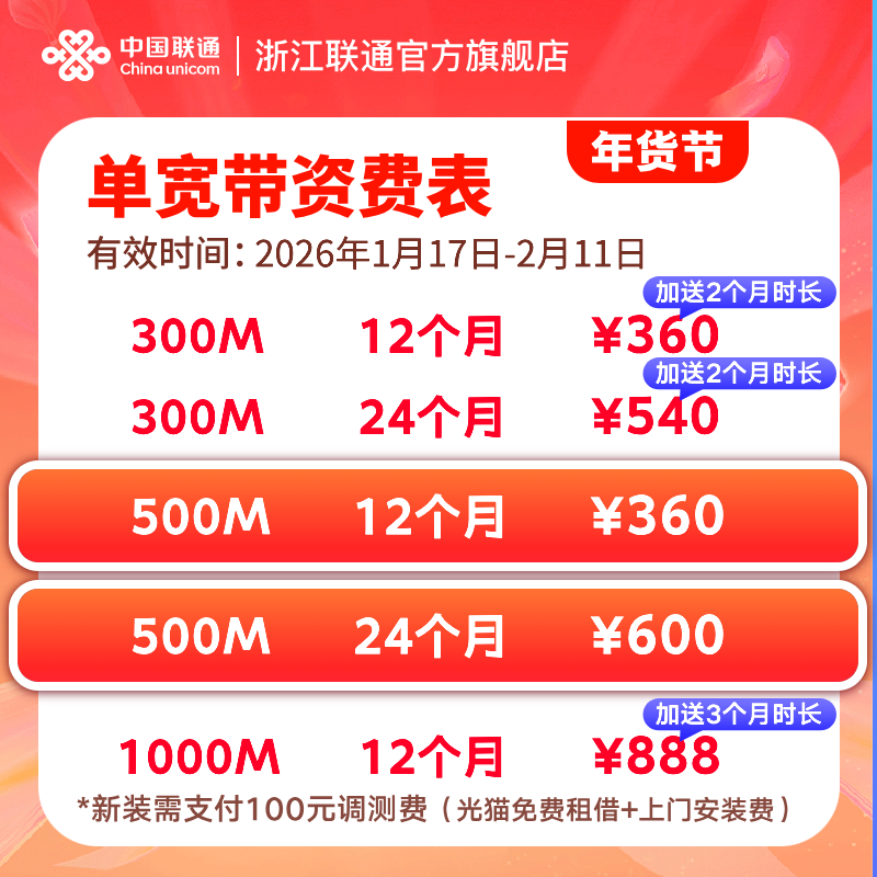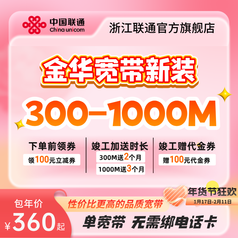 浙江金华联通宽带新装300m~1000m有线光纤宽带办理包年上门安装
