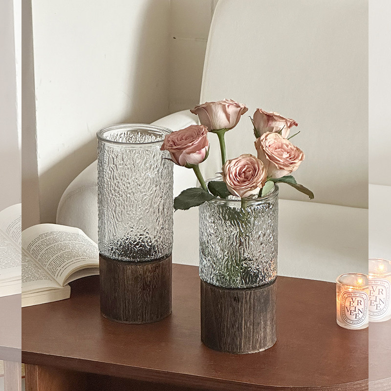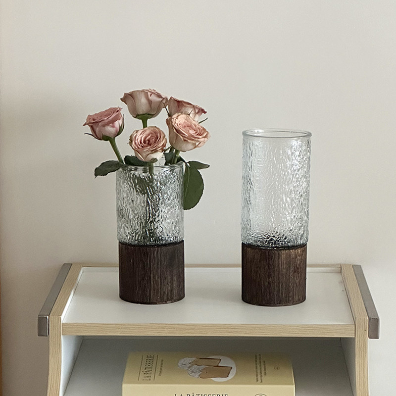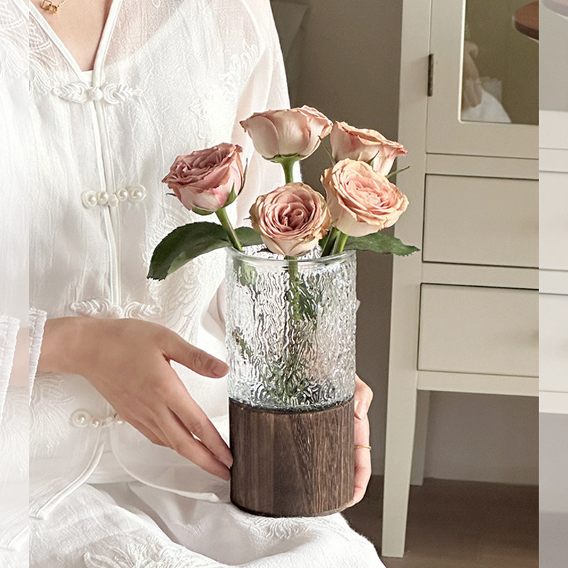 简约创意木托新中式玻璃花瓶直筒鲜花仿真花插花客厅书房装饰摆件