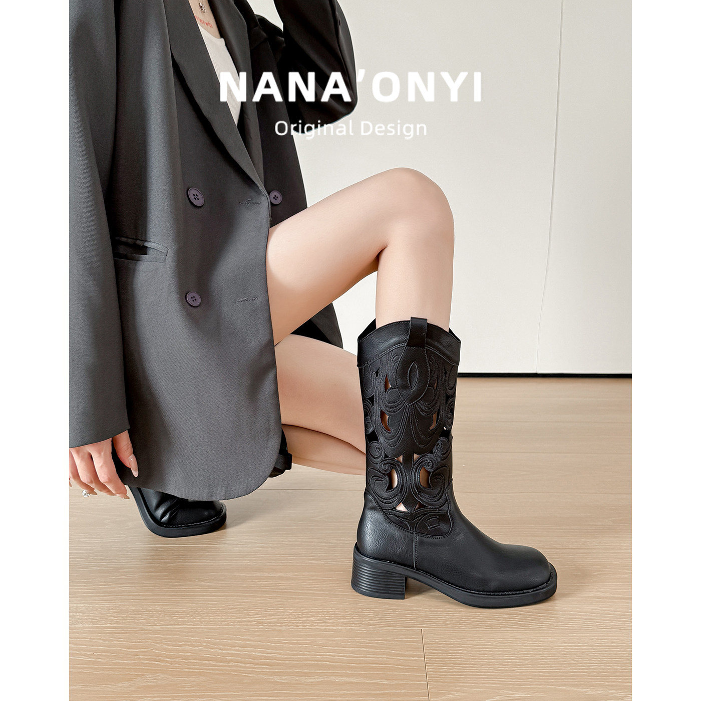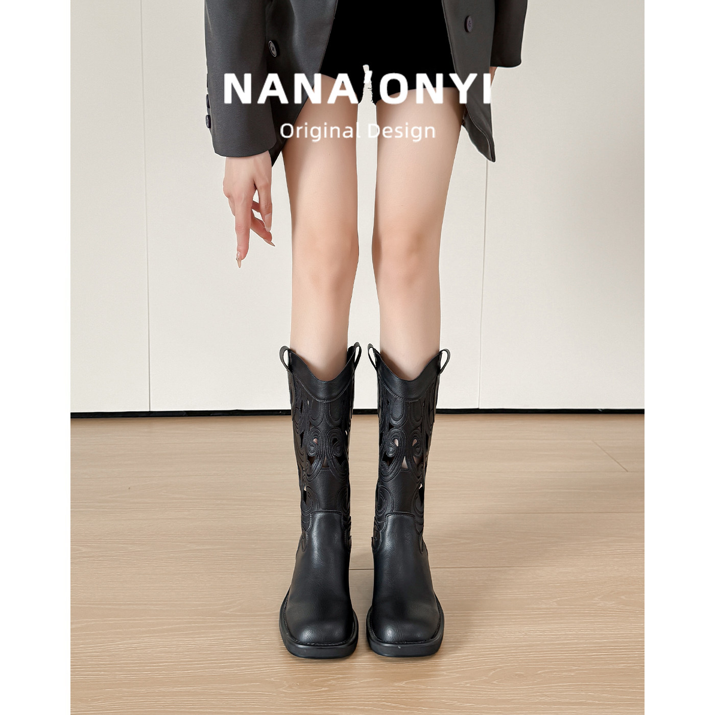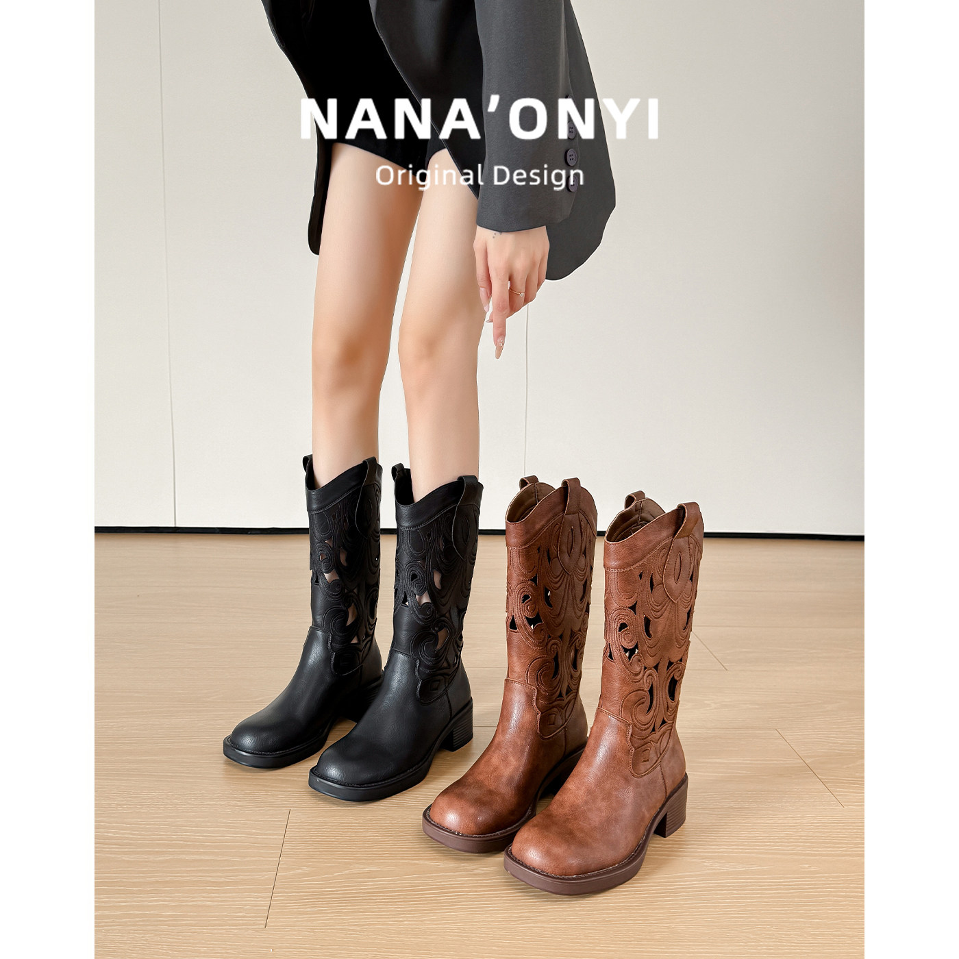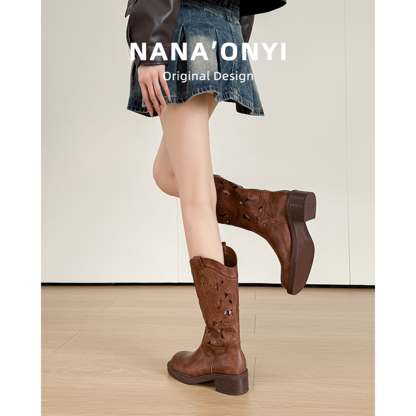 羊皮款~真皮刺绣棕色复古西部牛仔靴镂空夏季骑士靴中筒靴马丁靴