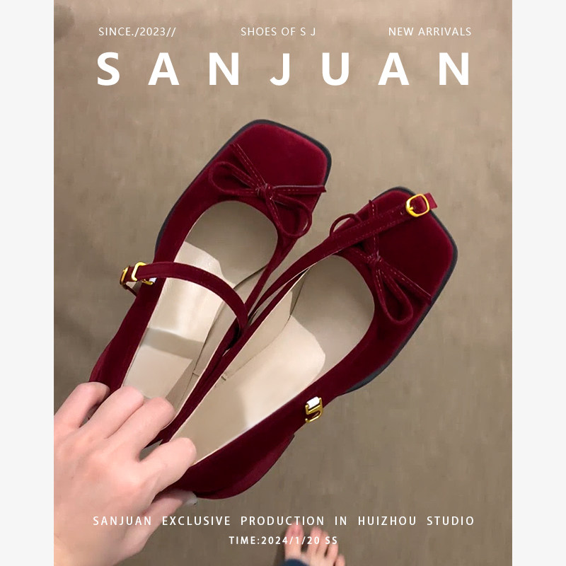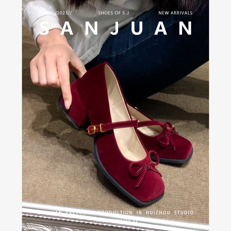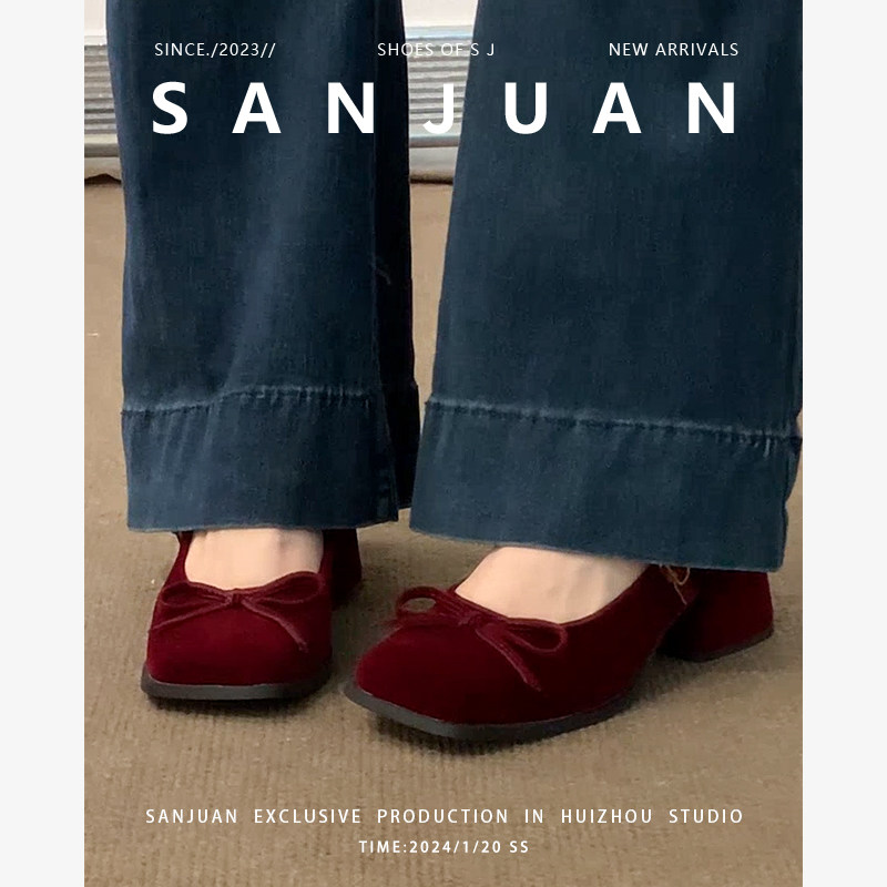 羊皮版sanjuan三卷玛丽珍婚鞋红色单鞋粗跟高跟鞋方头小皮鞋增高