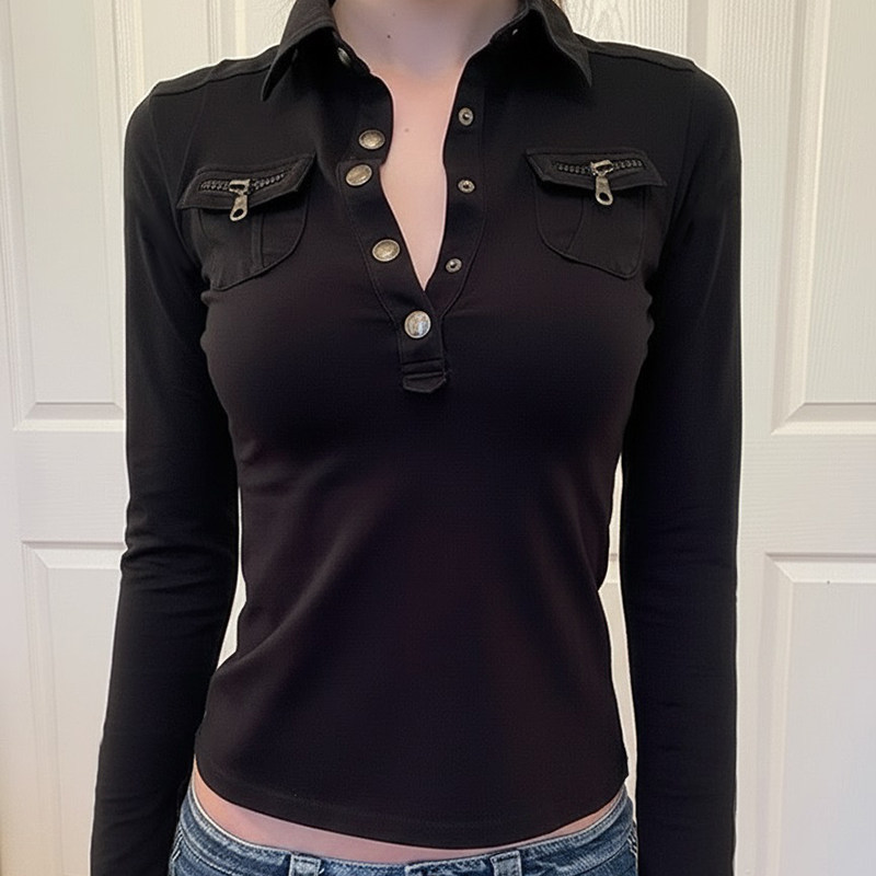 ROCKMORE【美式复古】工装风黑色显瘦长袖T恤辣妹金属扣V领polo衫