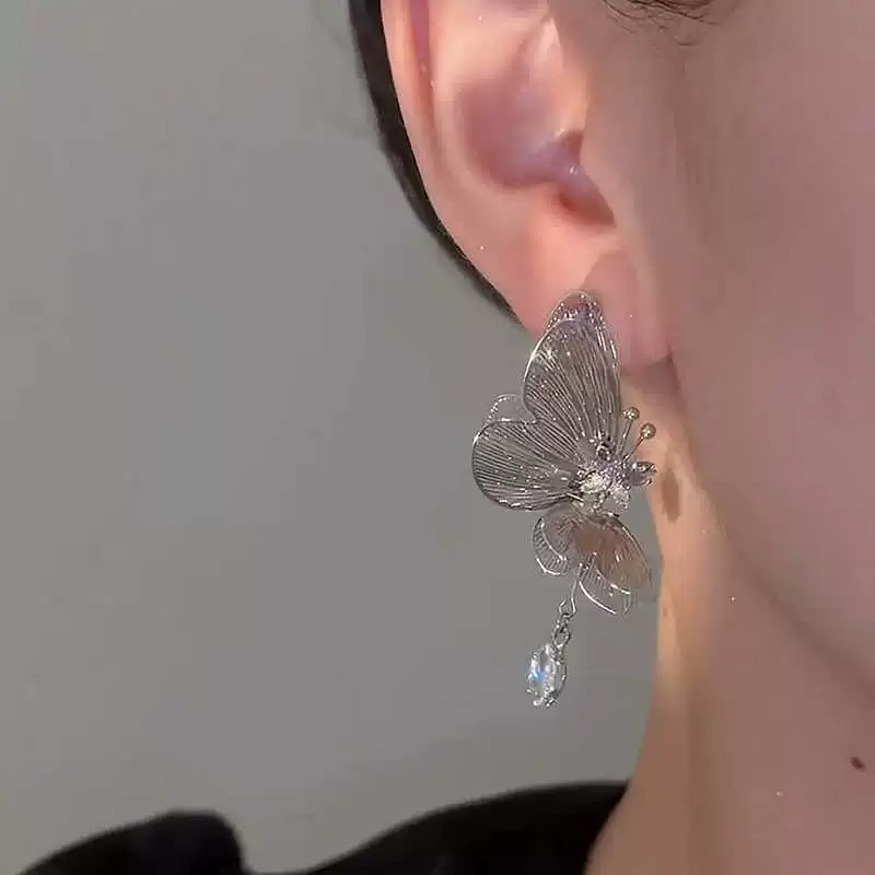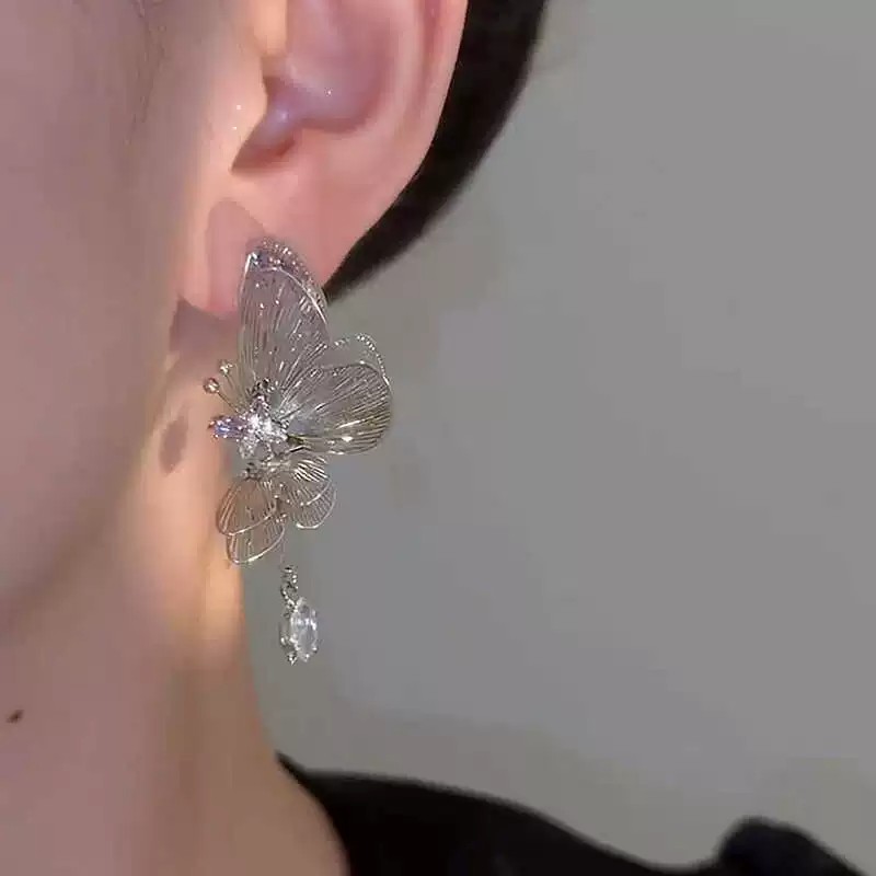 镂空立体银色蝴蝶吊坠耳环气质个性设计感长款流苏耳饰银针耳钉女