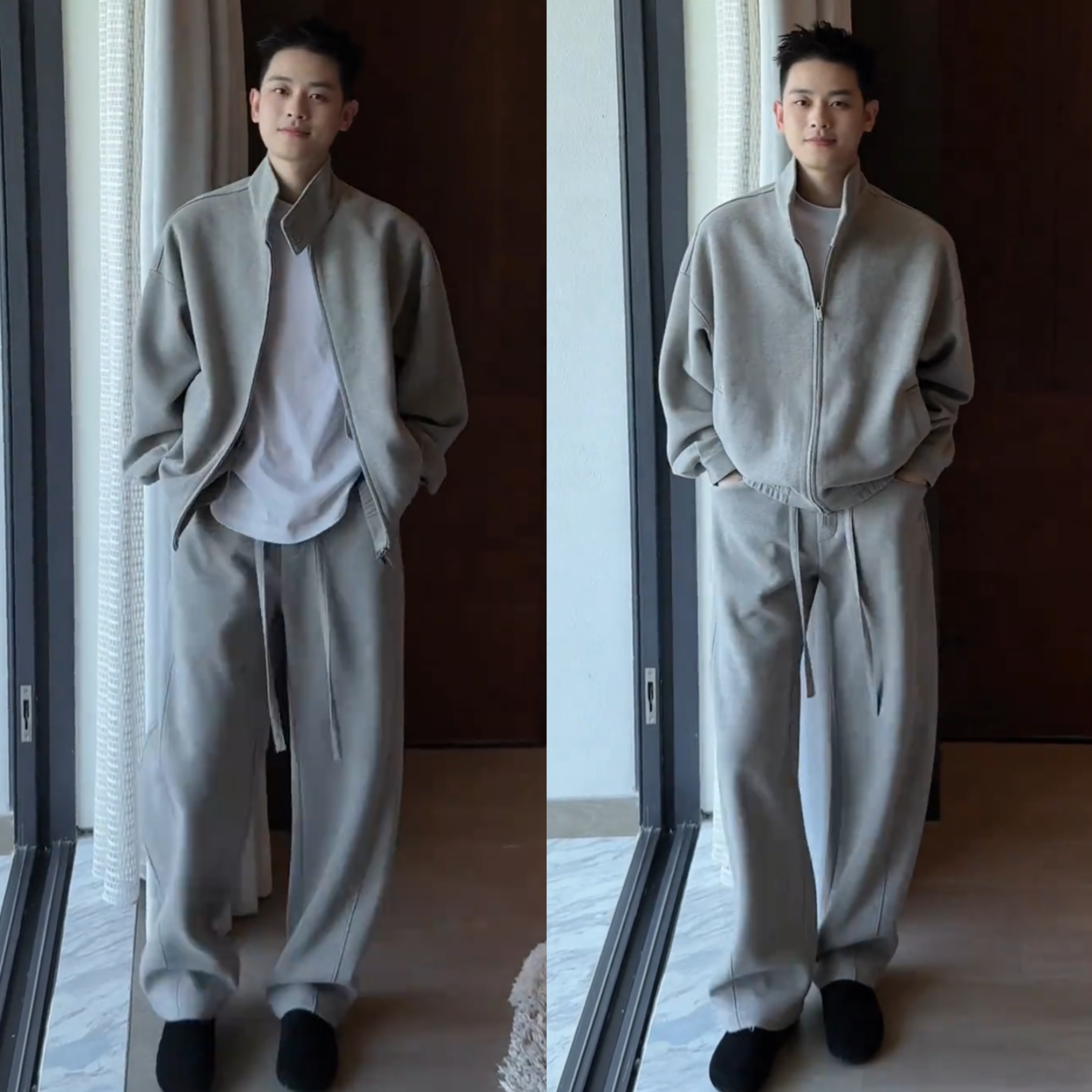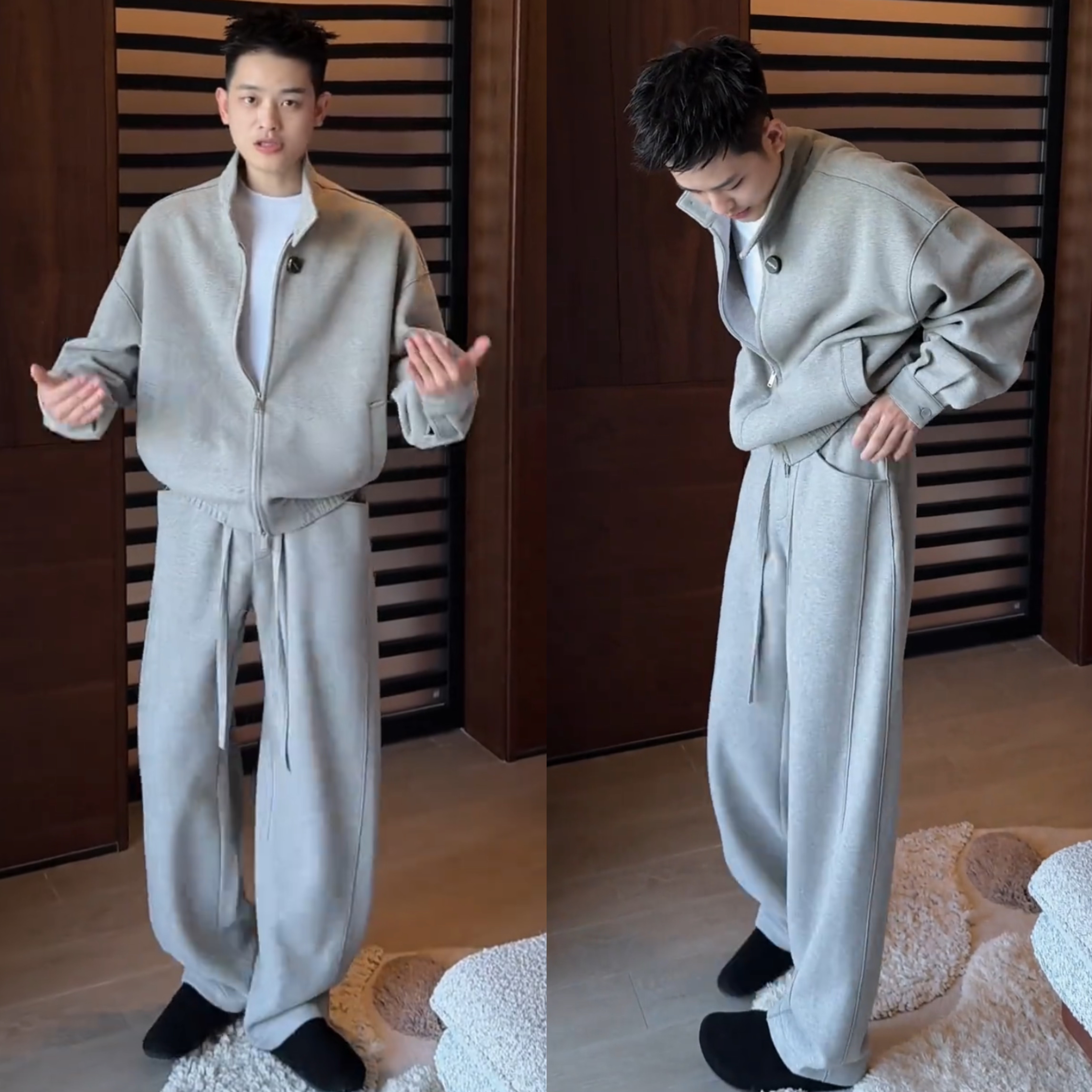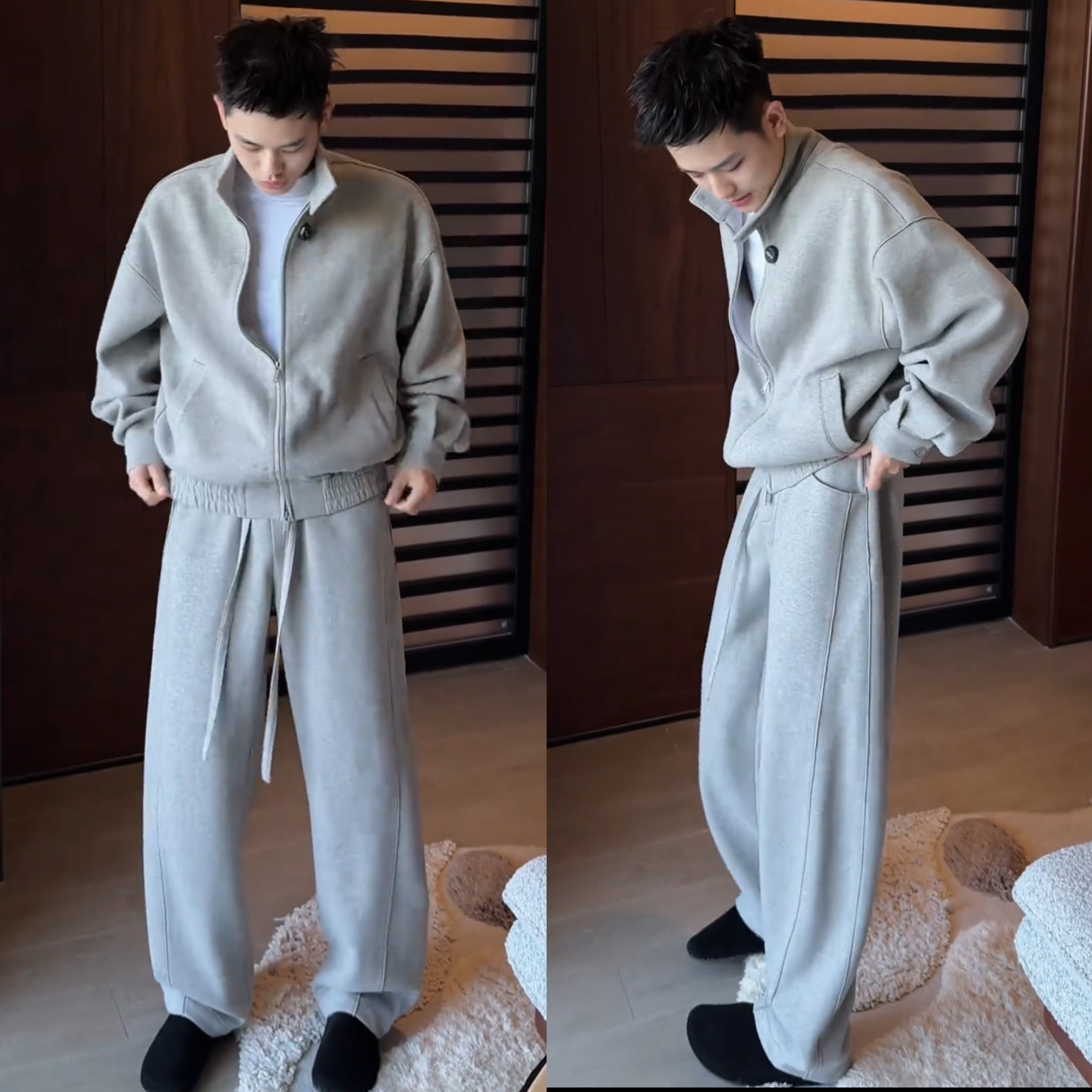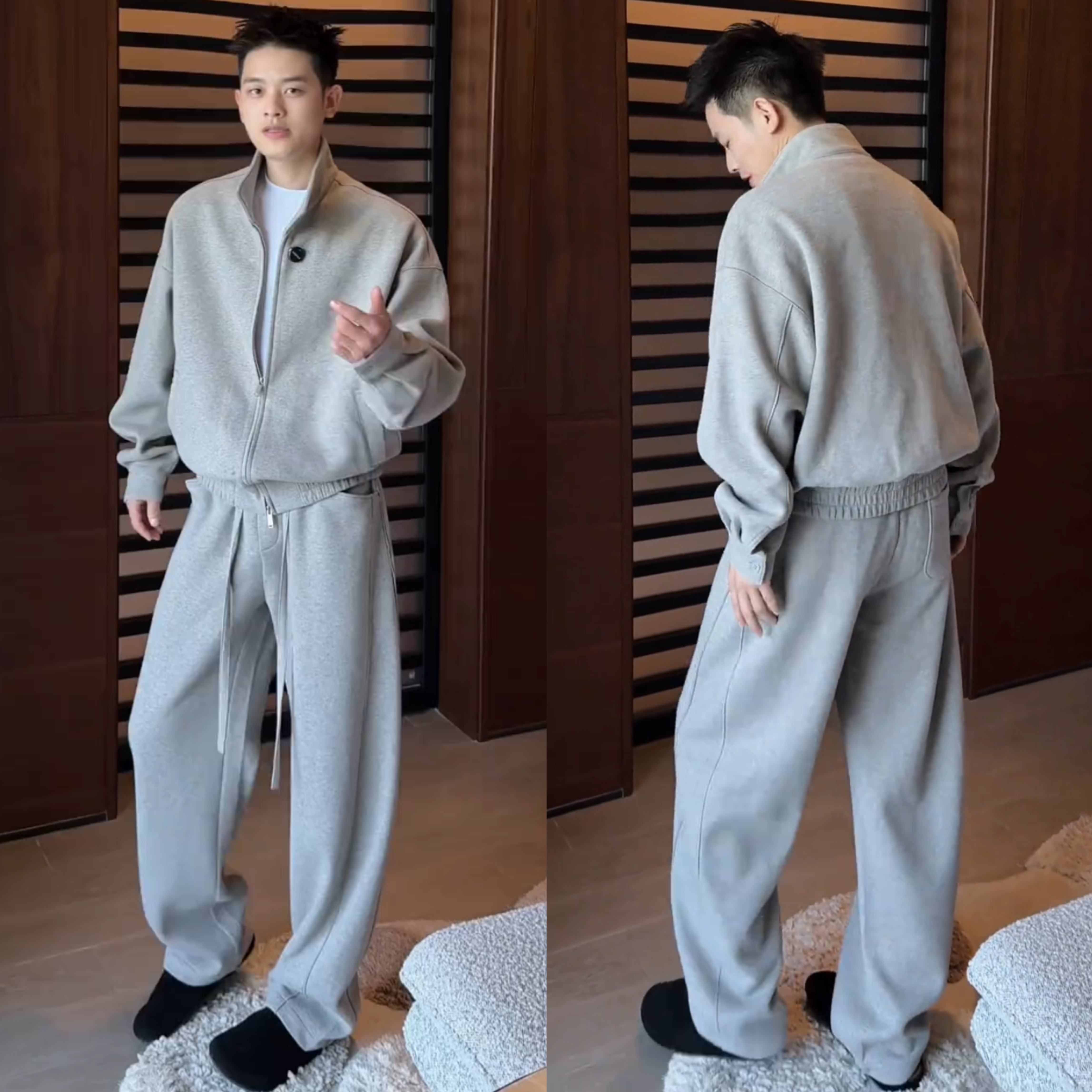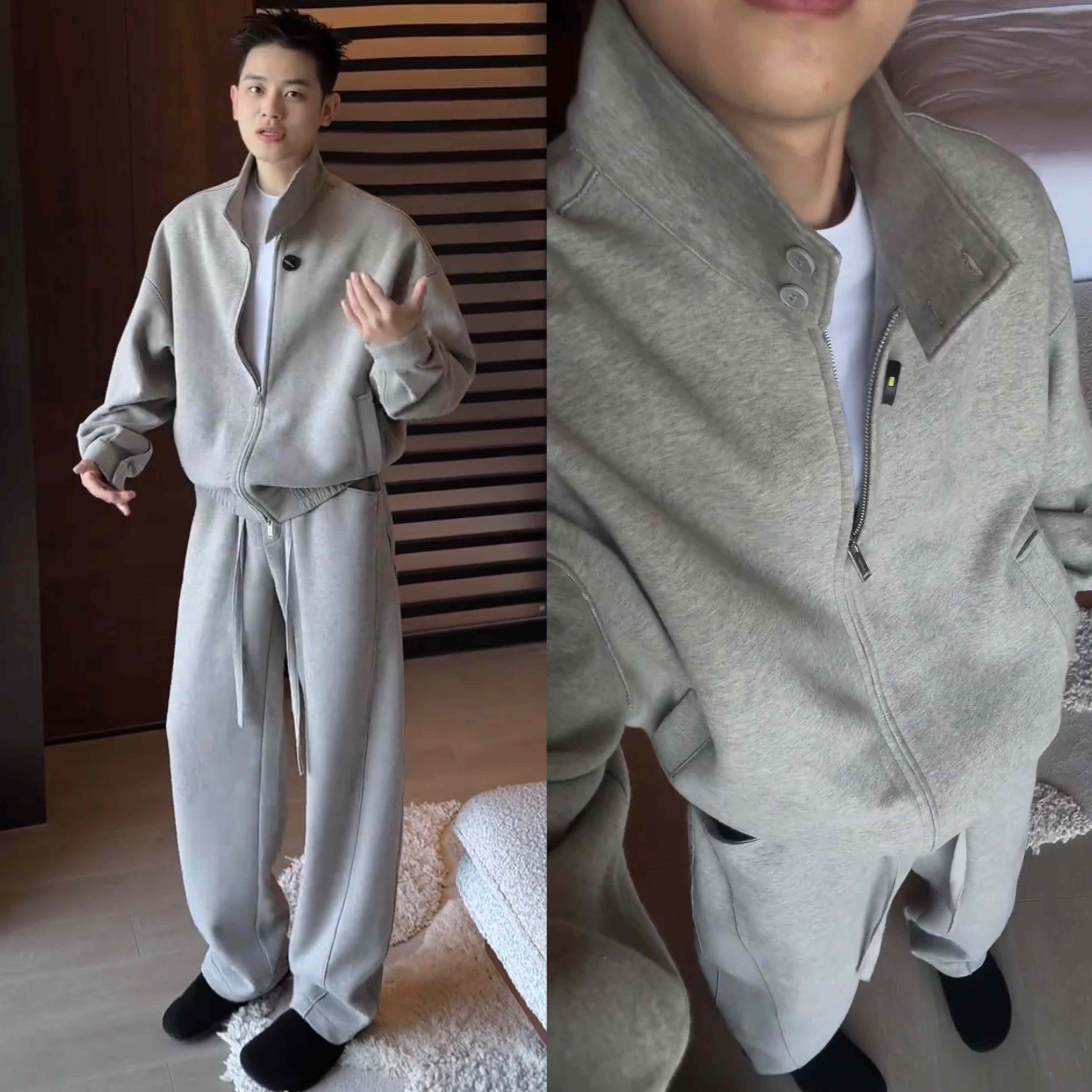春季新款老钱风高级感休闲套装男时尚宽松开衫卫衣阔腿长裤两件套