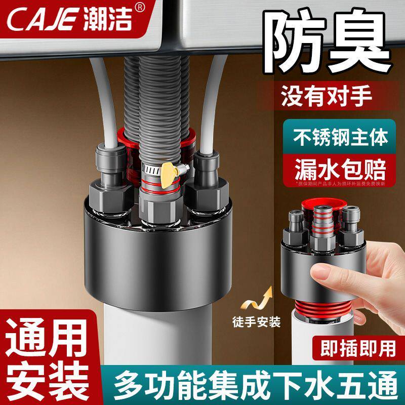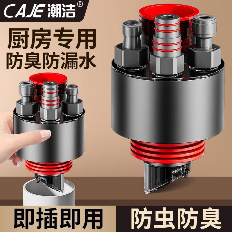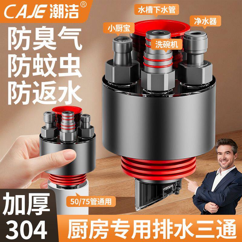 潮洁厨房下水管四通防返臭神器水槽下水道密封塞通用接口抗压耐用