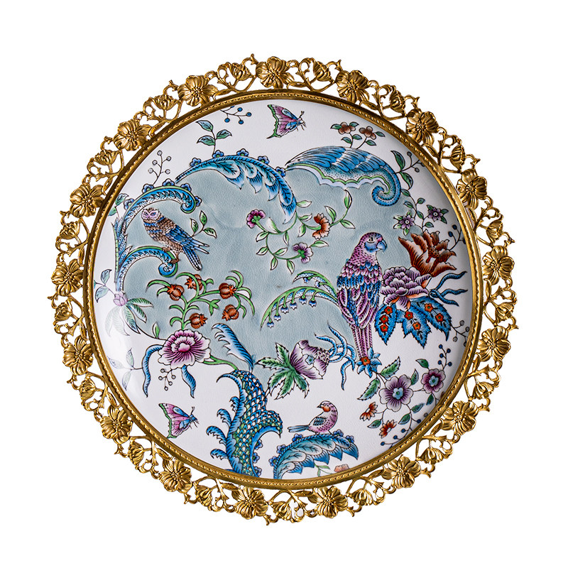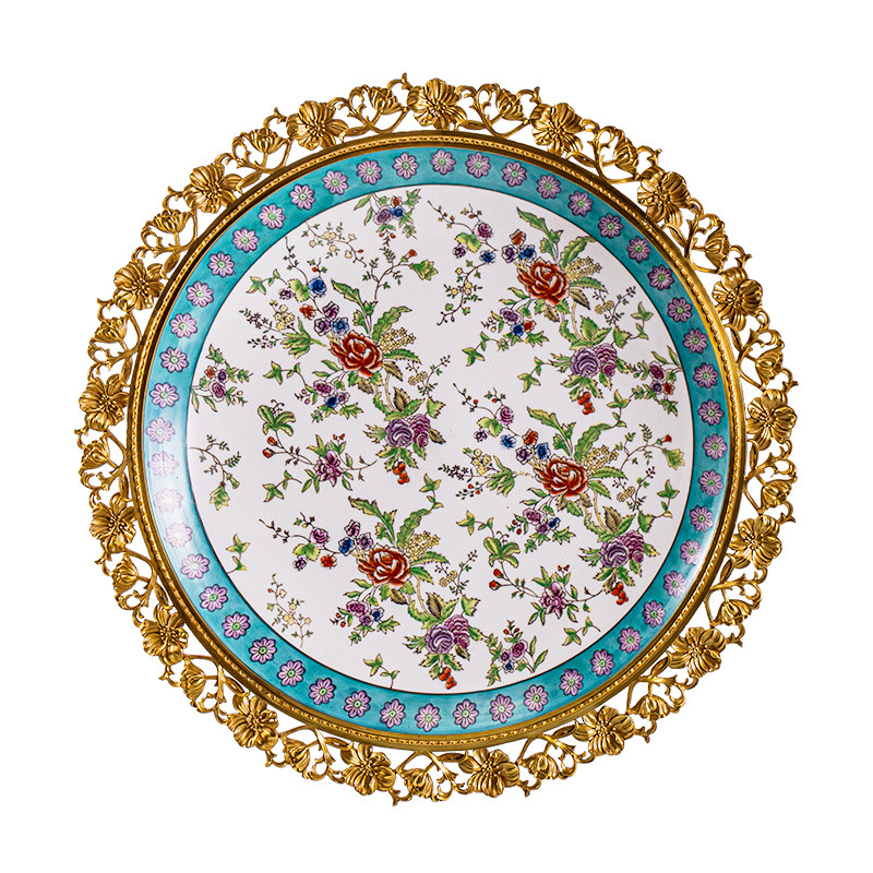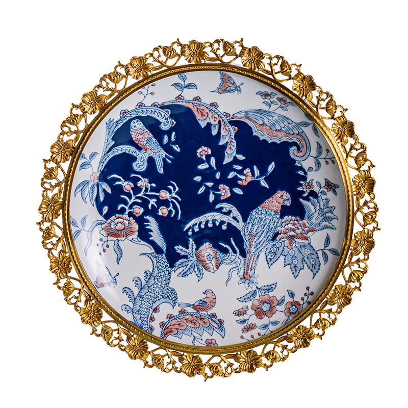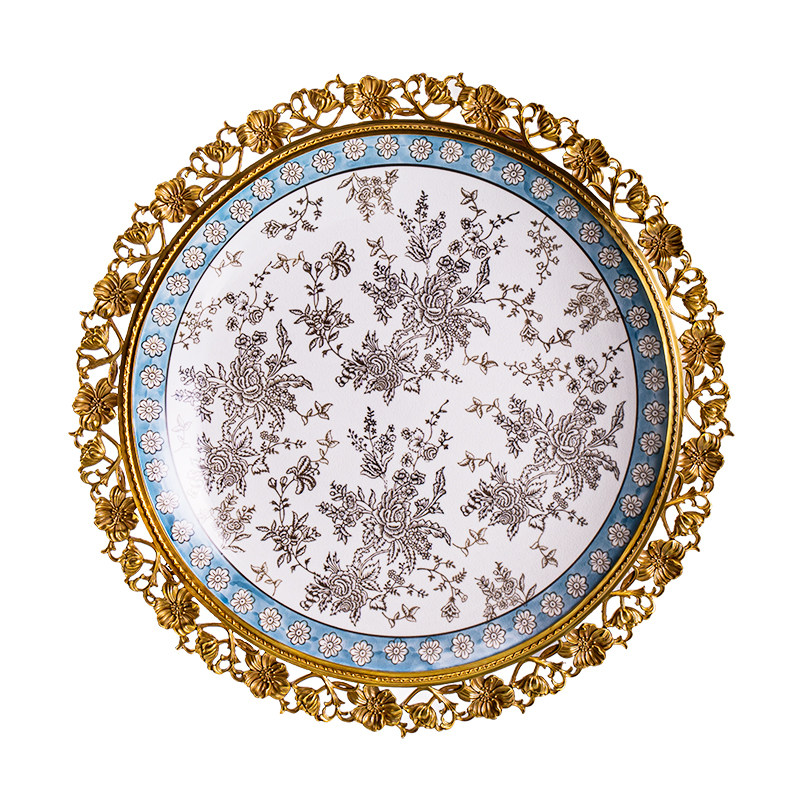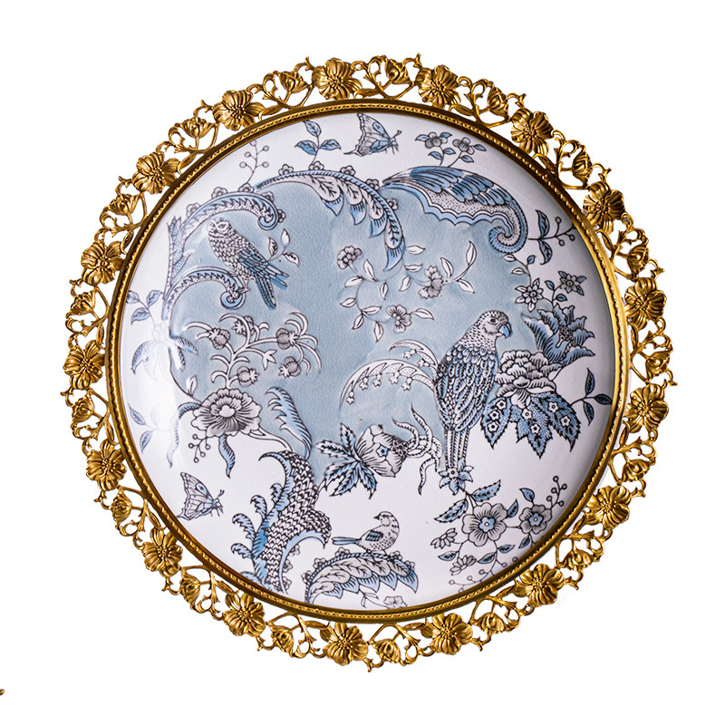 欧式陶瓷配铜花边圆形挂盘摆件 美式奢华客厅茶几坐盘家居装饰品