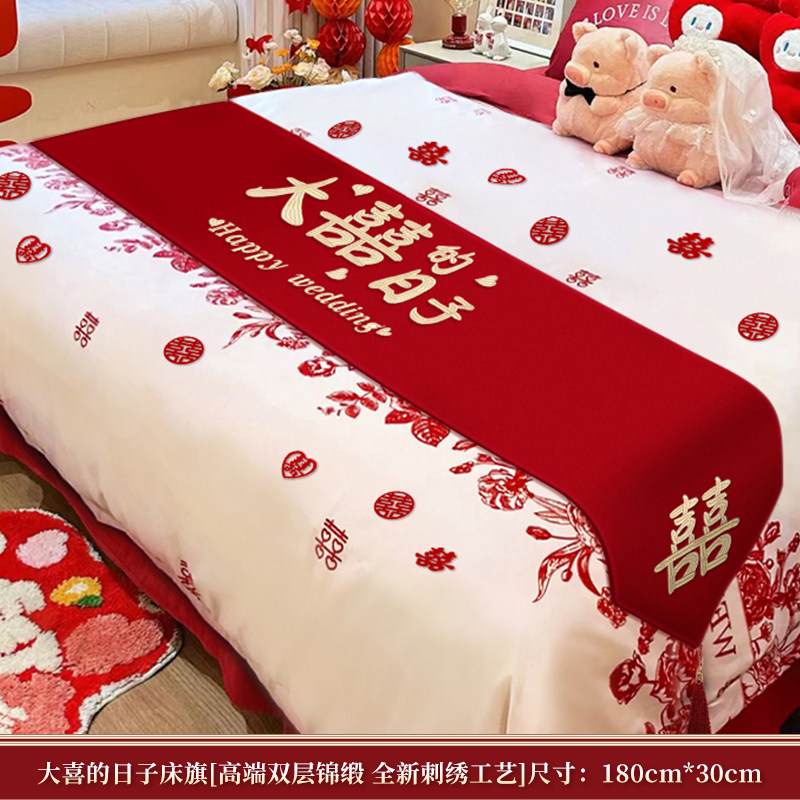 红色床旗结婚婚房布置床尾搭巾新婚床上用品压床喜字桌旗茶几盖布