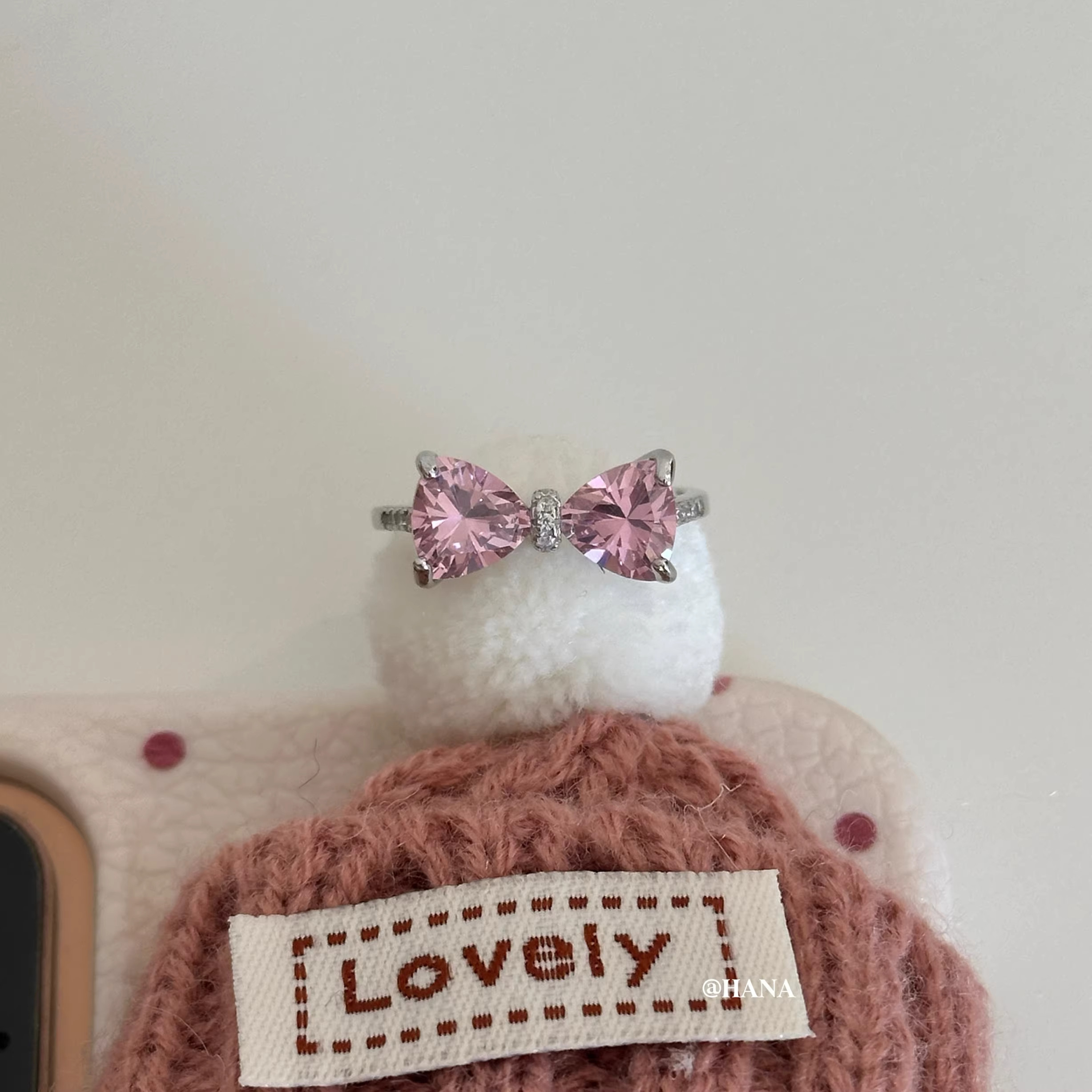 粉色水钻蝴蝶结戒指ins风法式精致微镶甜美小众开口指环饰品
