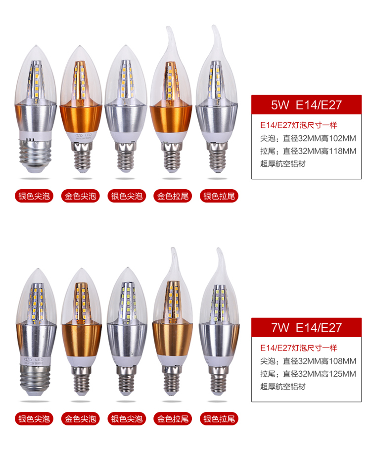 led灯泡e14小螺口蜡烛灯光源拉尾暖白光高亮变色e27节能家用照明