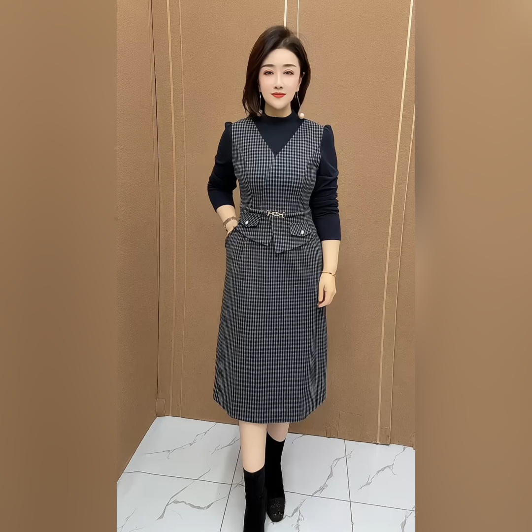 春季千鸟格气质收腰假两件拼接设计女士连衣裙百搭休闲大码打底裙