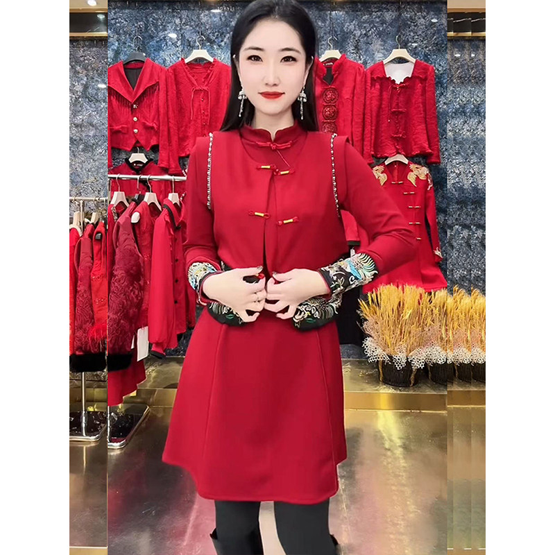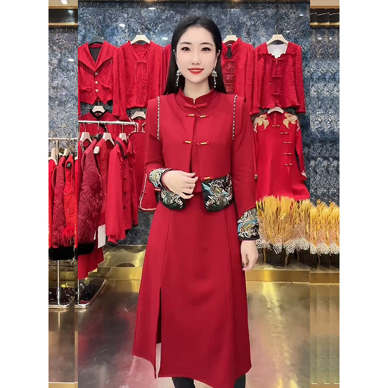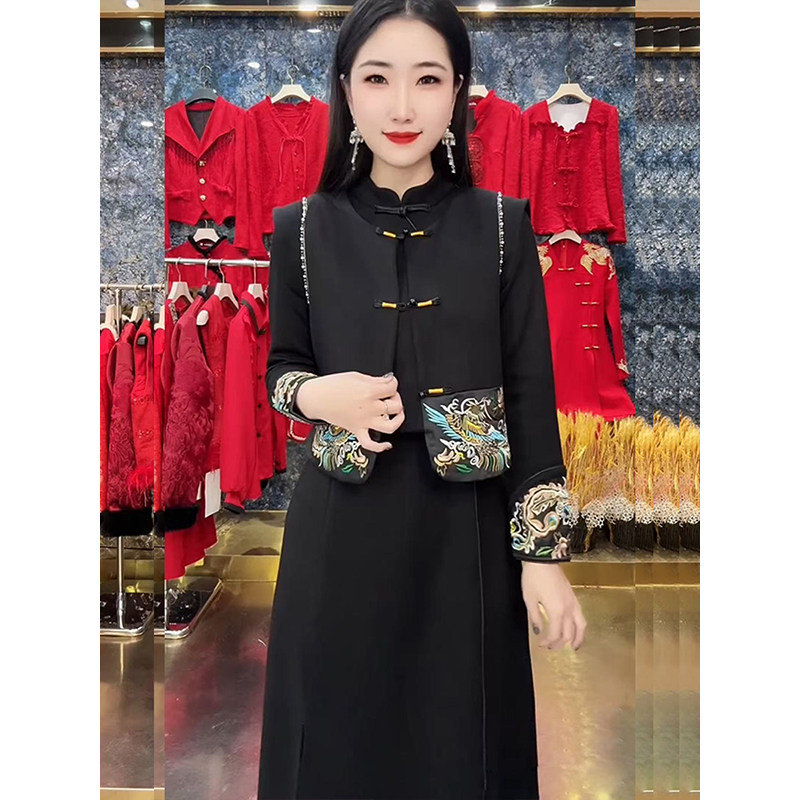 新中式国风盘扣刺绣马甲+旗袍连衣裙2025秋冬新款重工高级感套装
