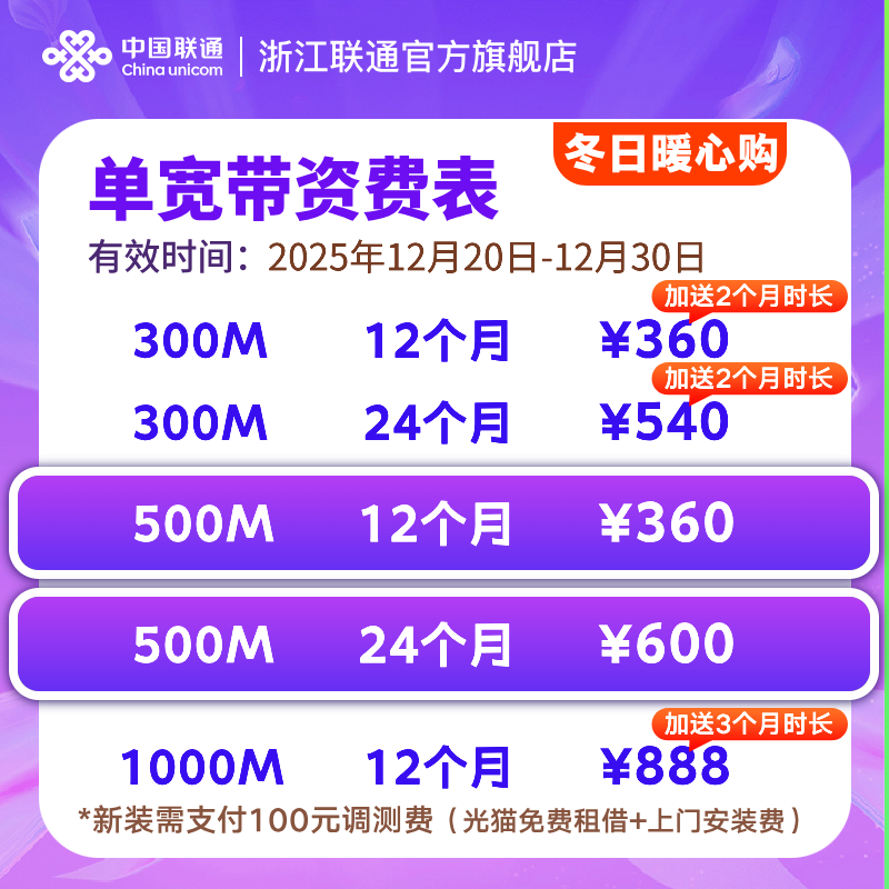 浙江杭州联通宽带新装300m~1000m有线光纤宽带办理包年上门安装