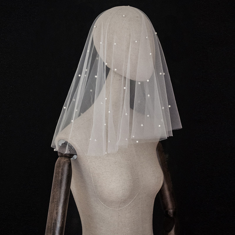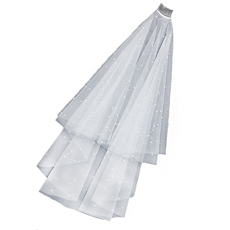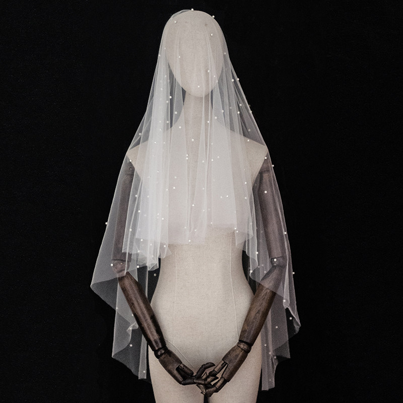 JINNYMENG新款定制甜美简约复古珍珠短长经典新娘头纱旅拍纱包邮