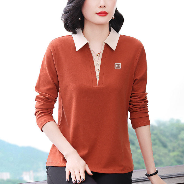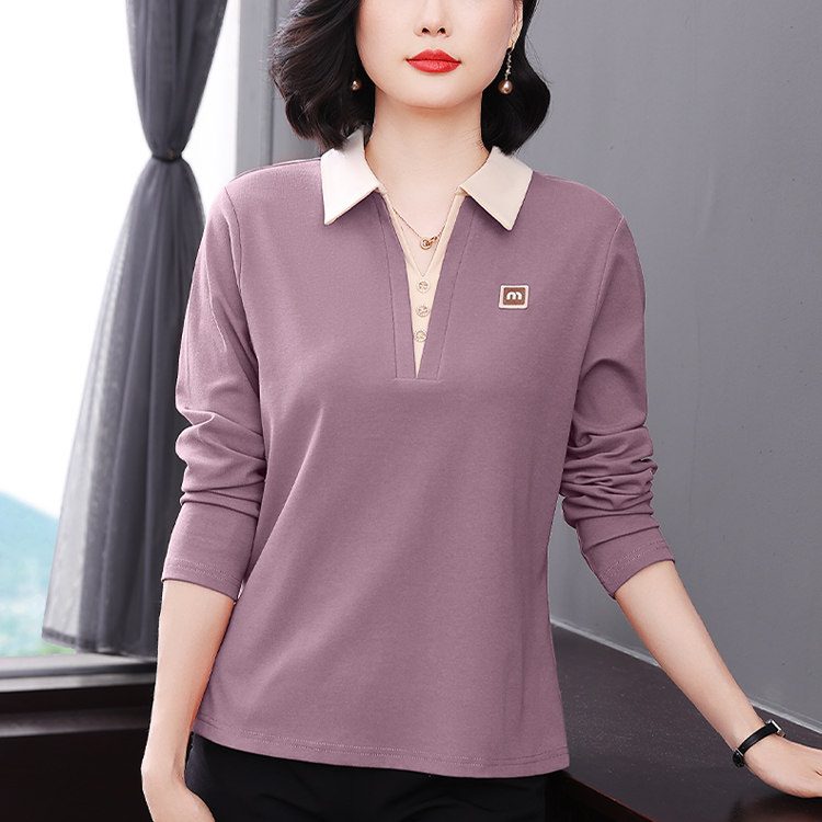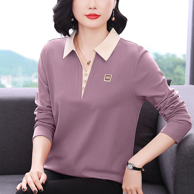 中老年时尚女装50多岁妈妈洋气上衣翻领纯棉长袖t恤女春装打底衫