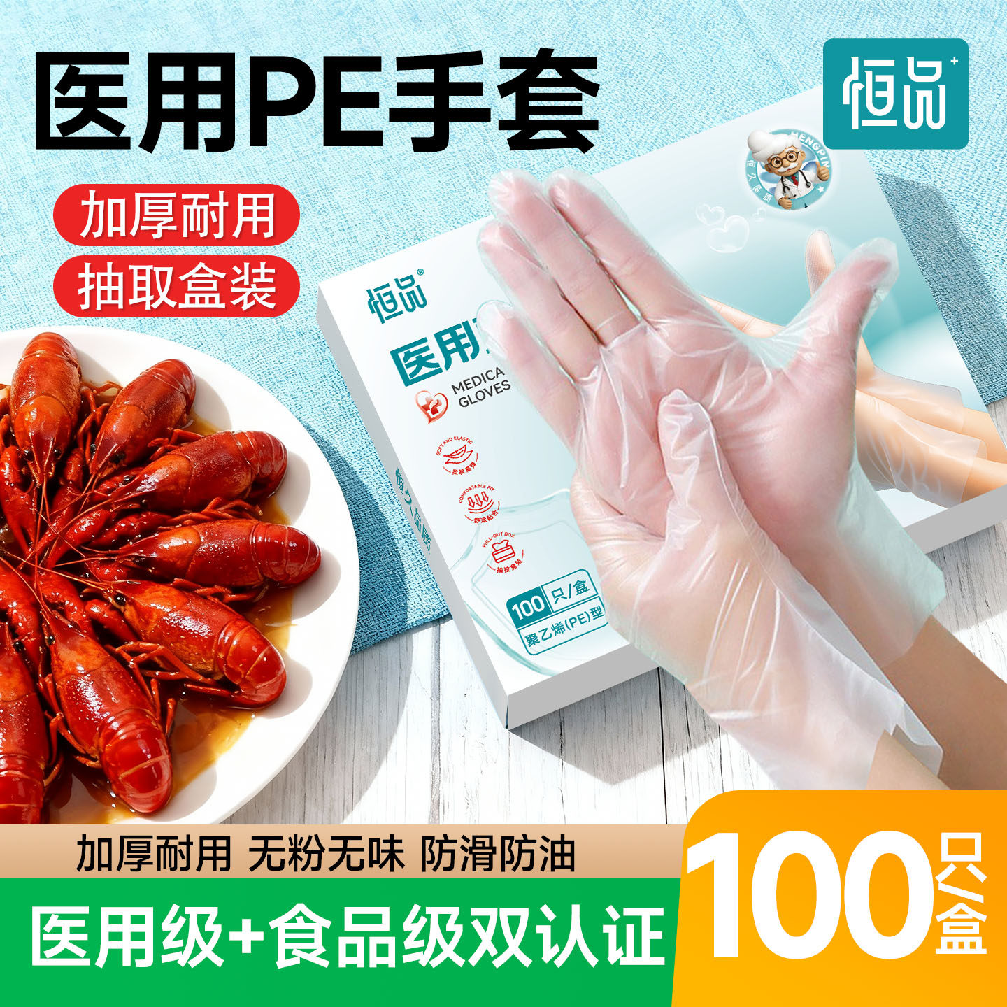 恒品一次性医用手套食品级专用透明薄膜医疗美容餐饮家务厨房耐用