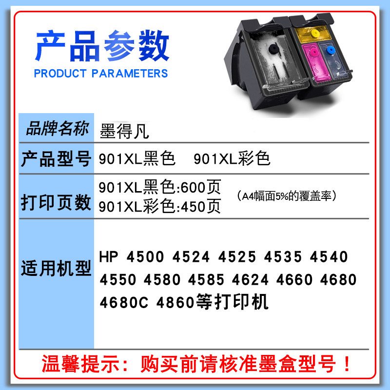 适用于惠普901墨盒彩连供hp4500 4640 J4580 4680 4660打印机连喷