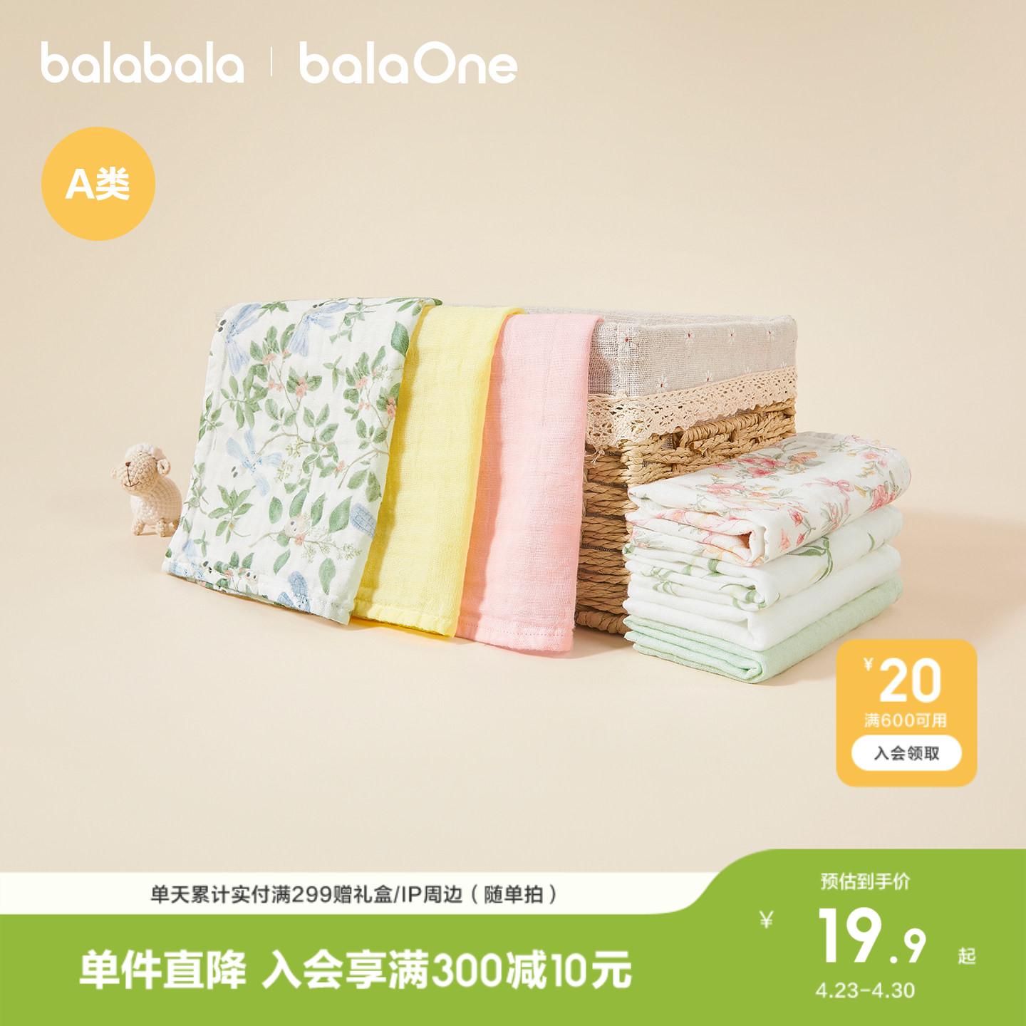 巴拉巴拉童装婴童用品宝宝纱布巾口水巾小方巾亲肤柔软三件装萌趣