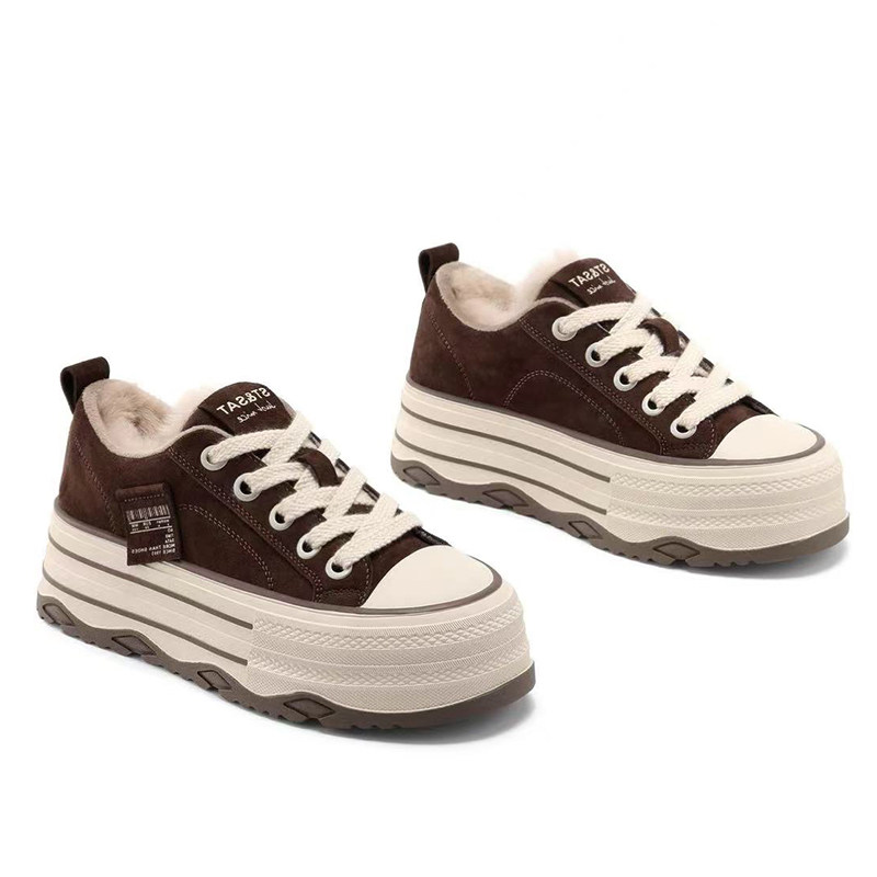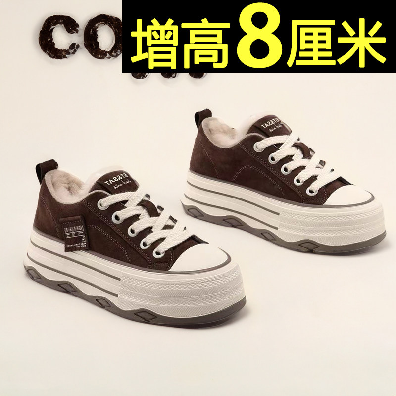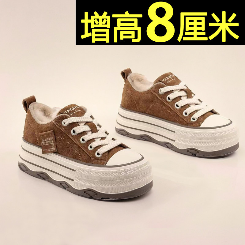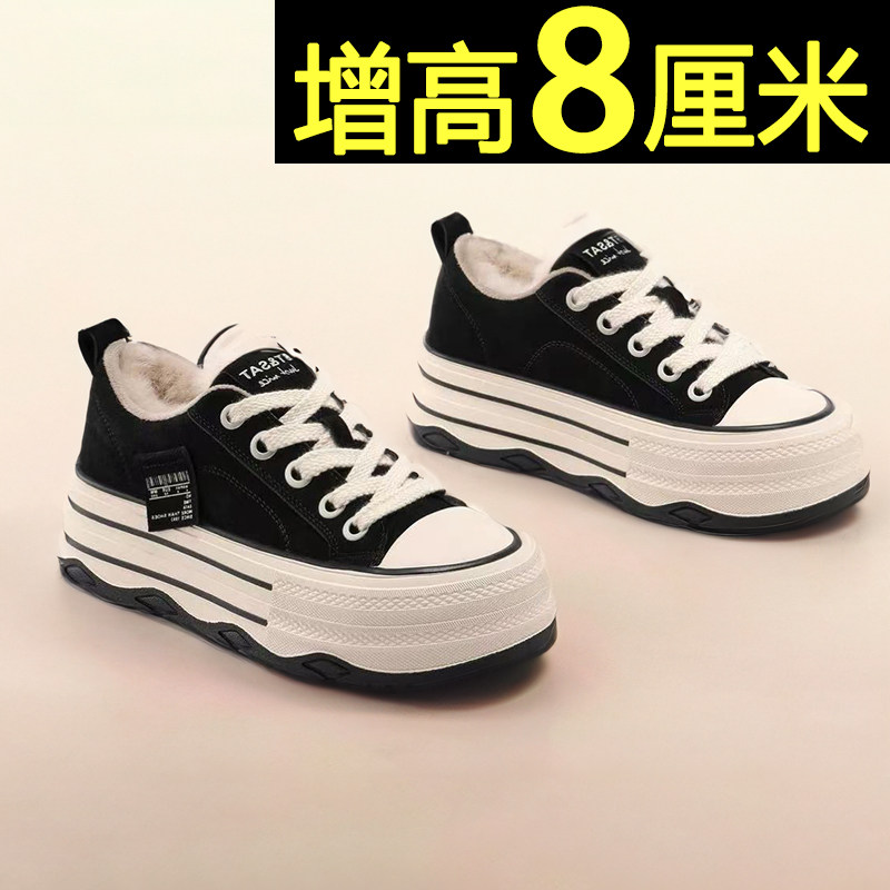 厚底帆布鞋女2025新款冬季加绒保暖松糕休闲板鞋内增高黑色运动鞋