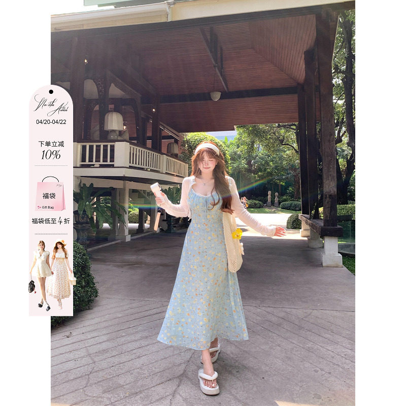 安妮不火 温柔系蕾丝花边雪纺碎花连衣裙女微胖大码收腰裙子套装