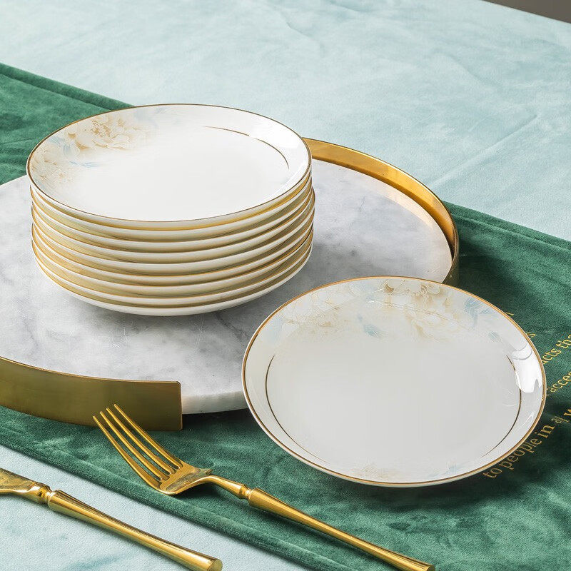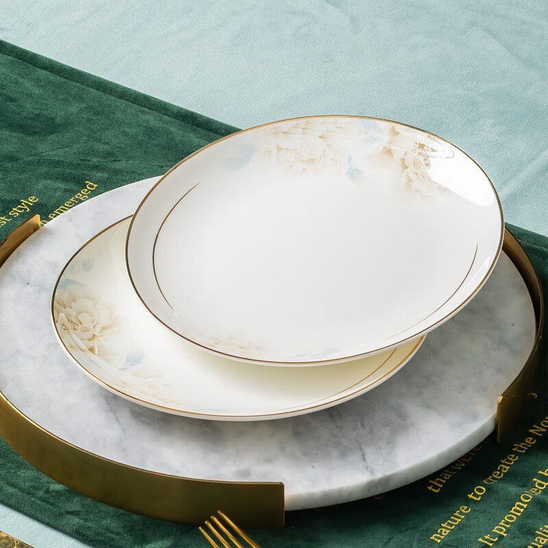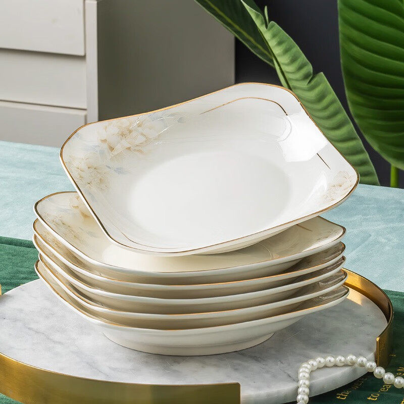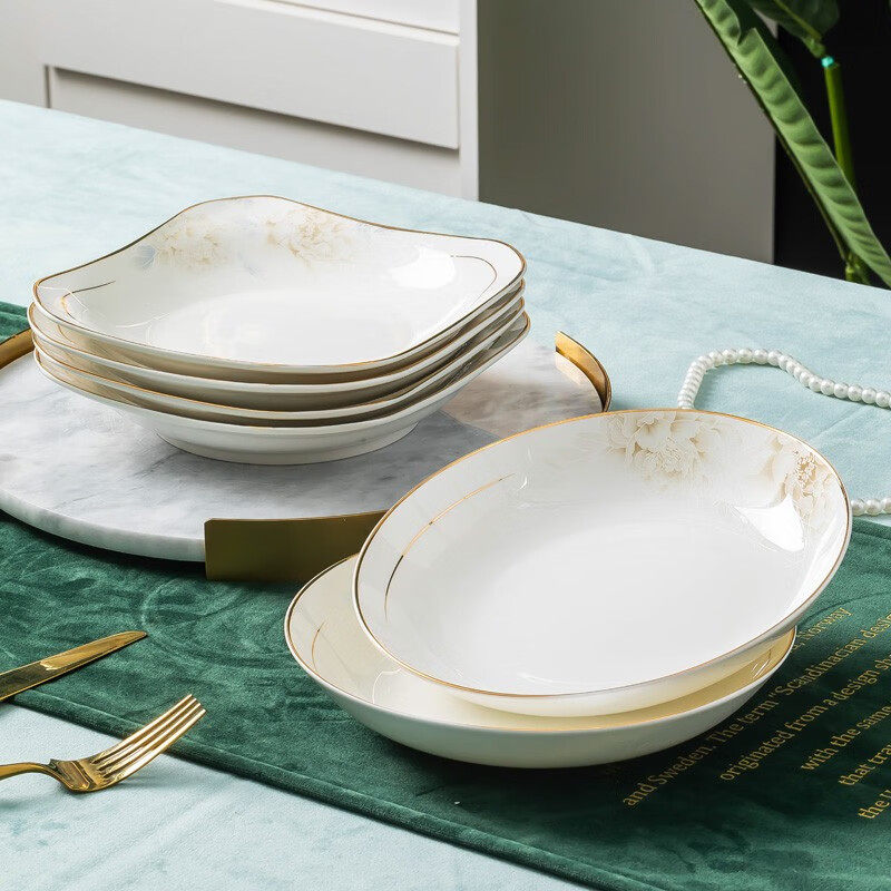 陶瓷盘子饭碗汤碗煲套装金边简约深菜盘碟子家用鱼盘西餐具组合