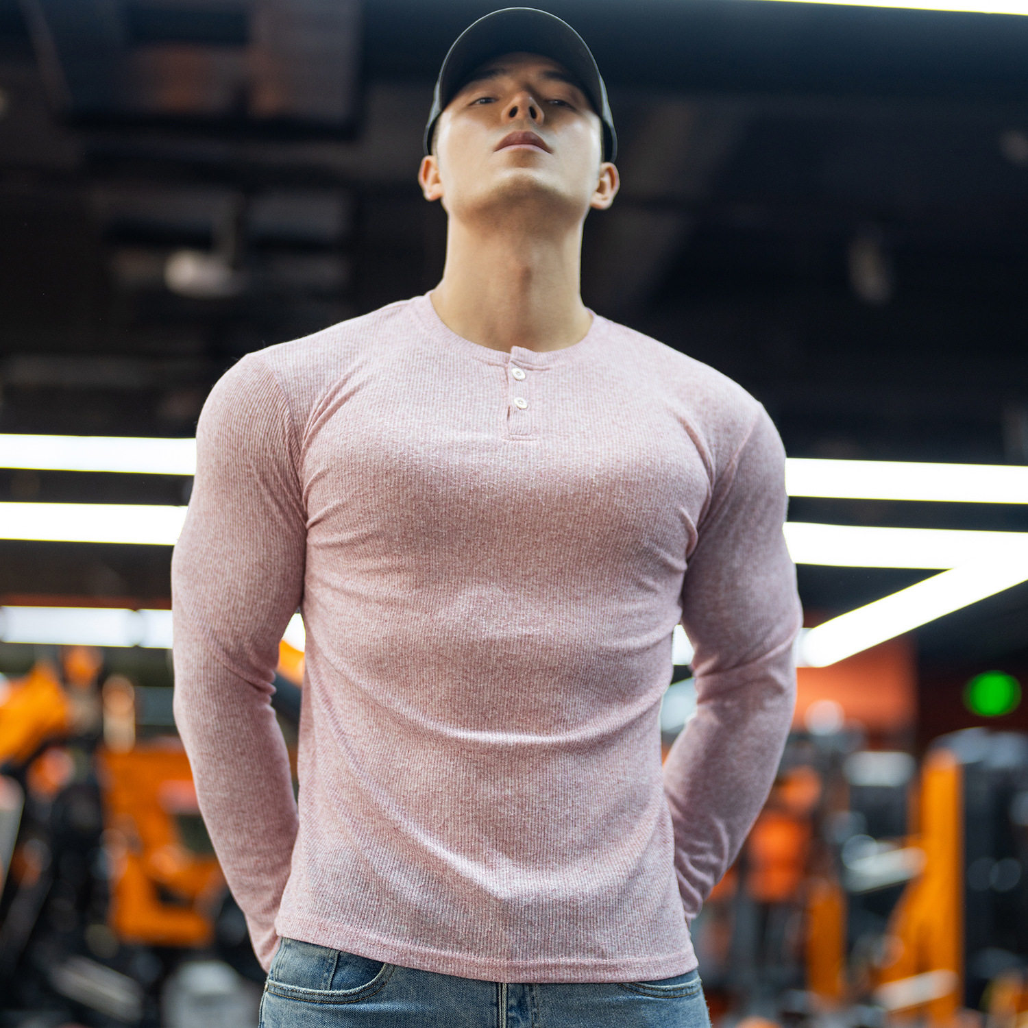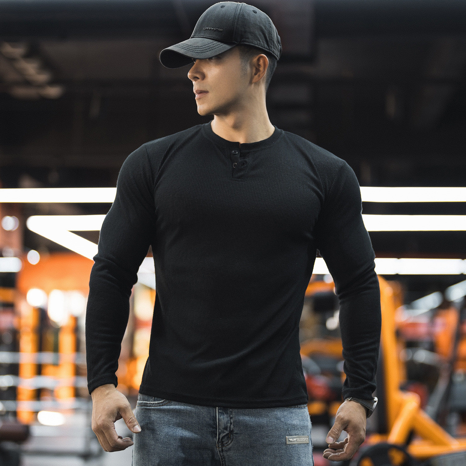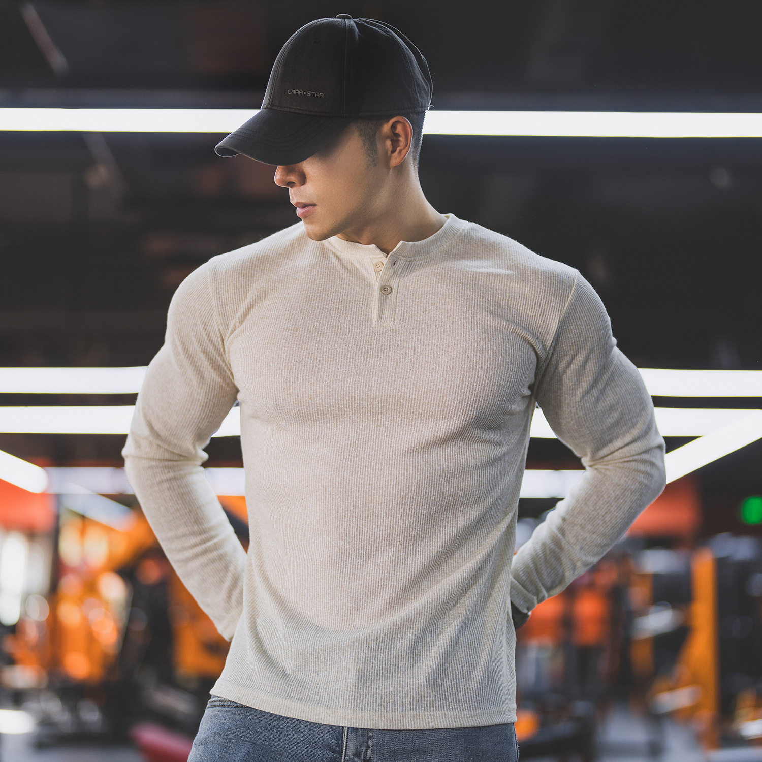 秋季运动长袖健身训练t恤男子跑步上衣高弹休闲修身亨利领打底衫