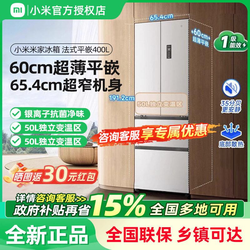 小米米家冰箱400L法式四门一级60cm超薄平嵌小户型家用厨房电冰箱