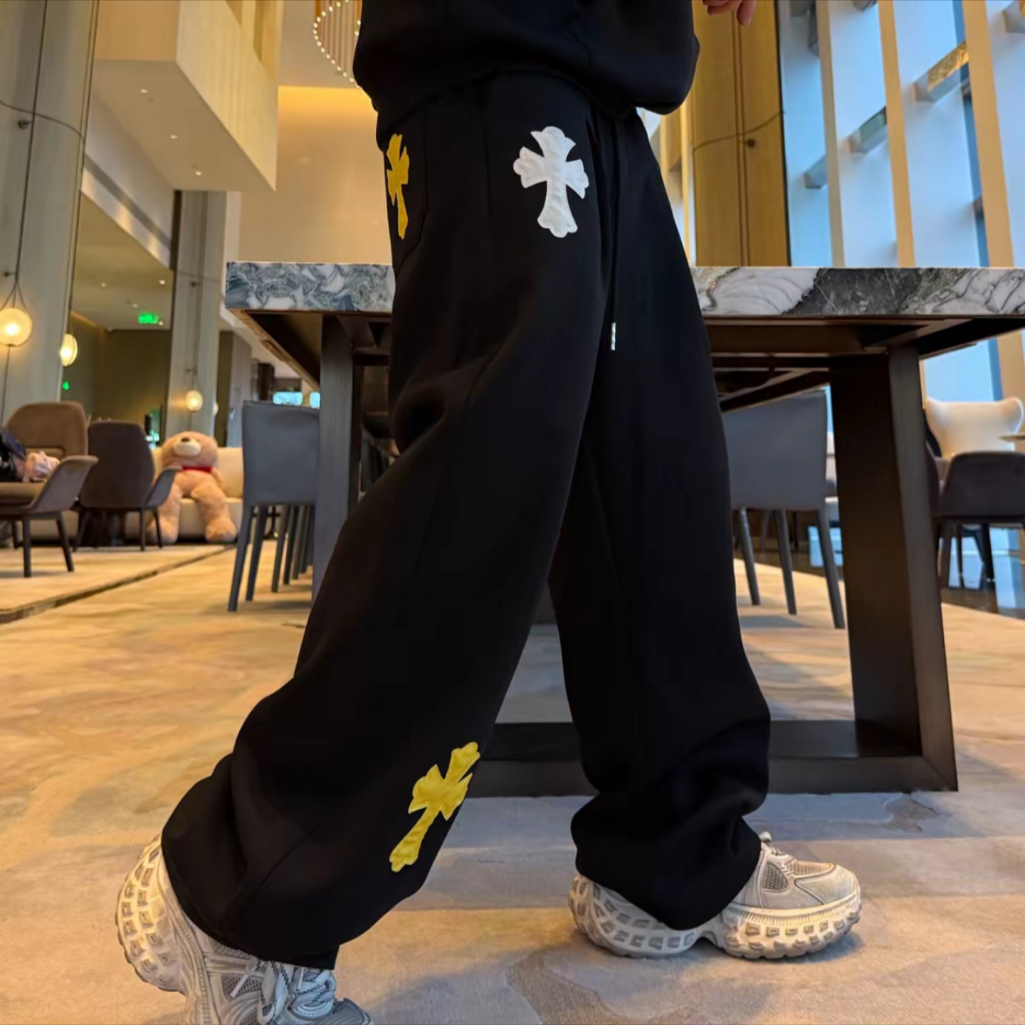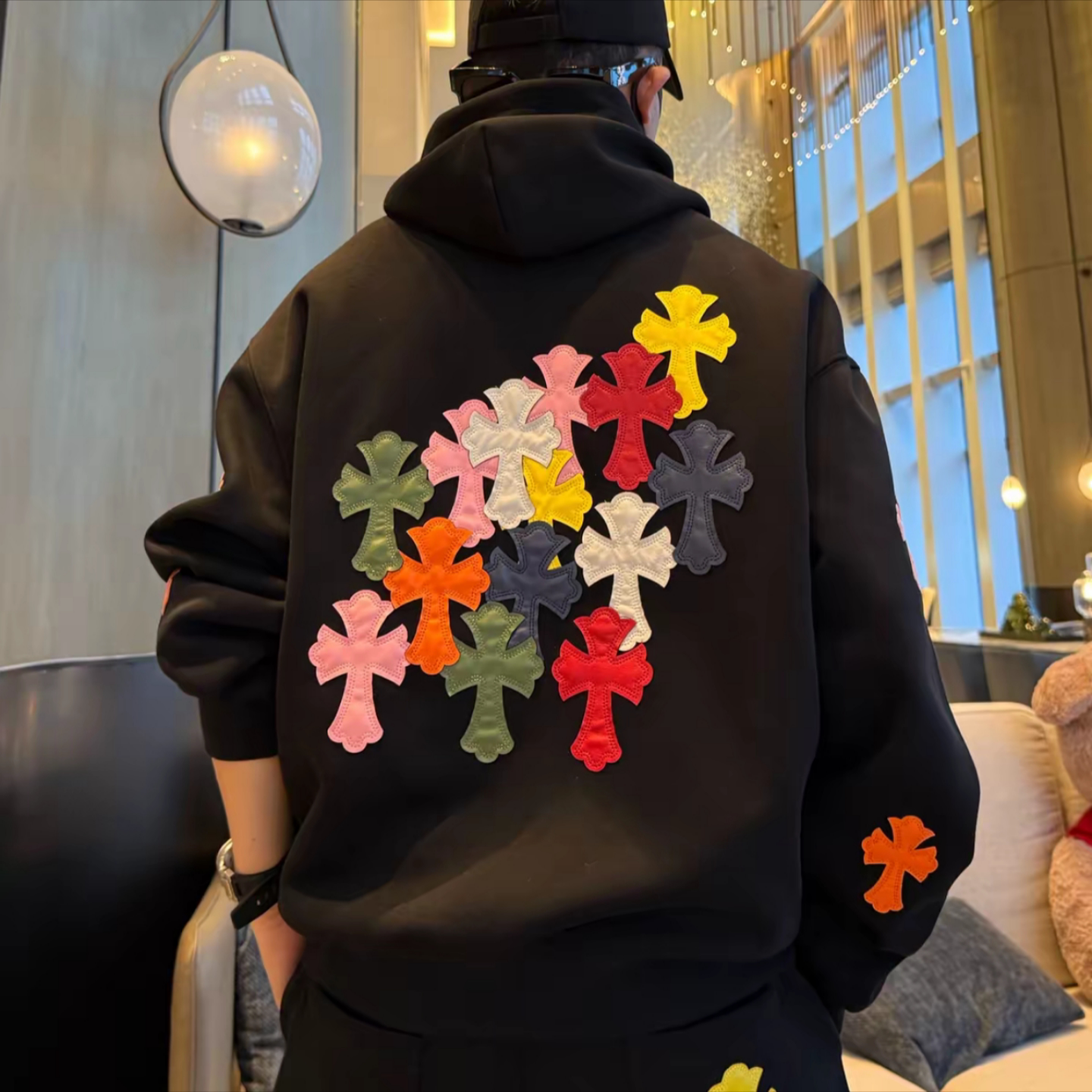 冬季男士炫彩十字架连帽套头卫衣休闲裤加绒套装潮流小众高级时尚