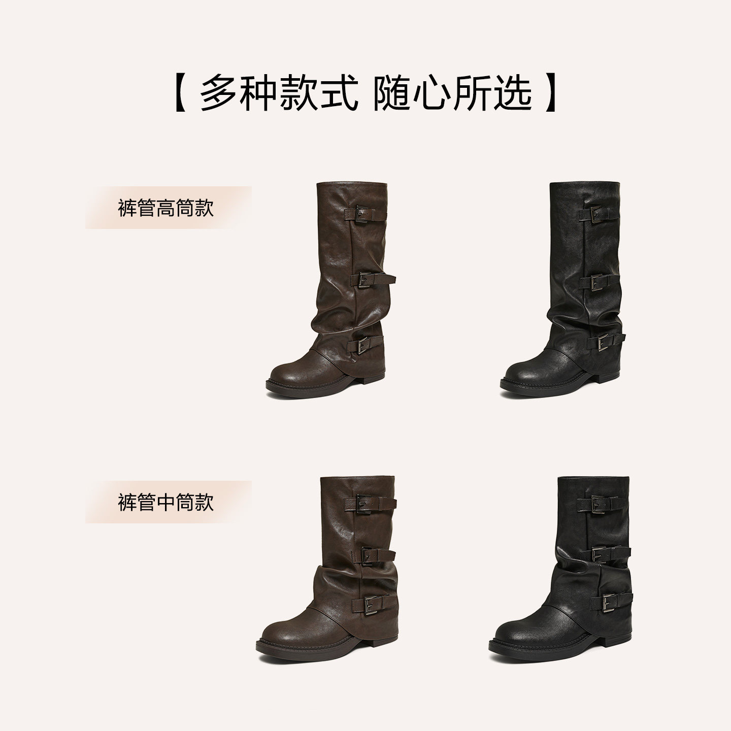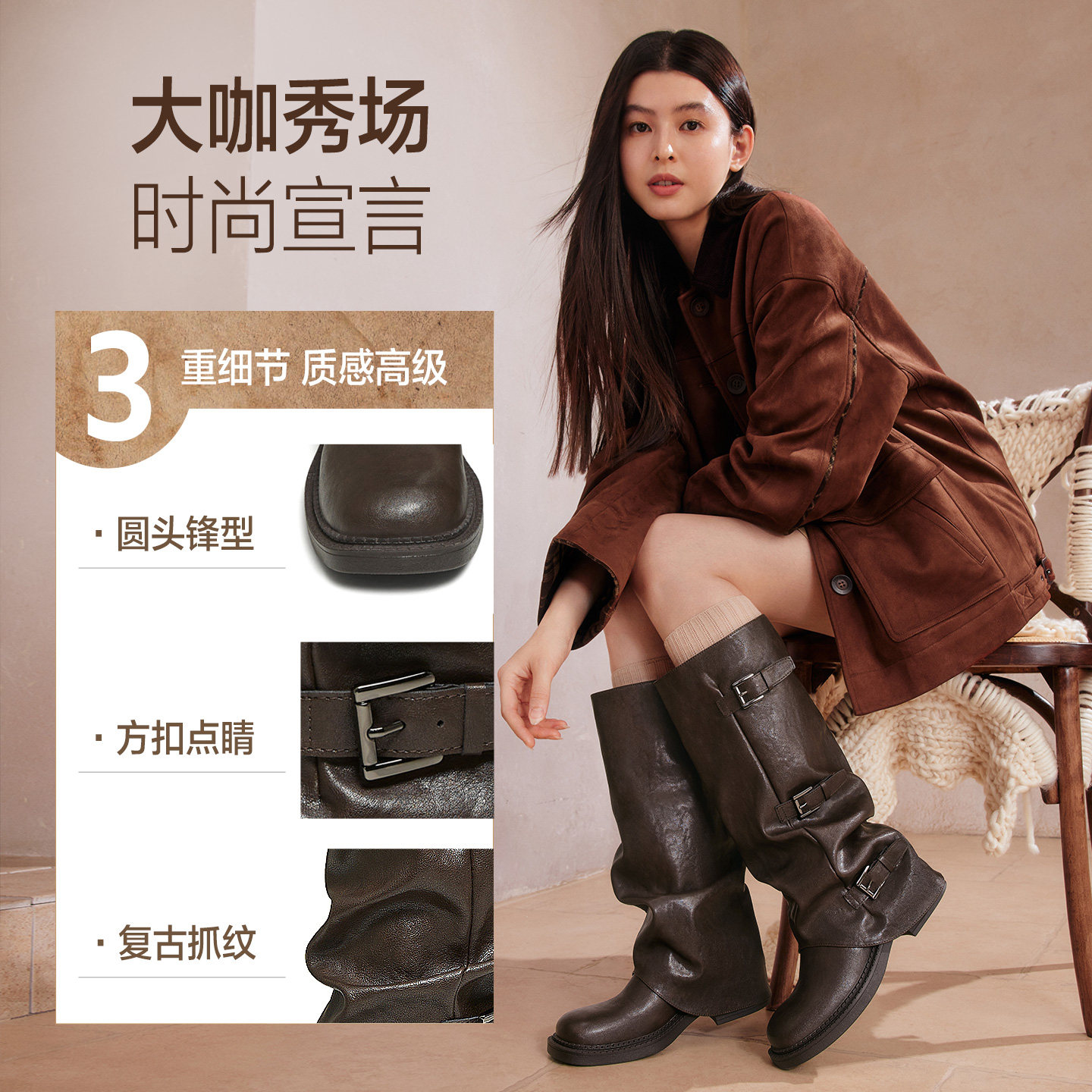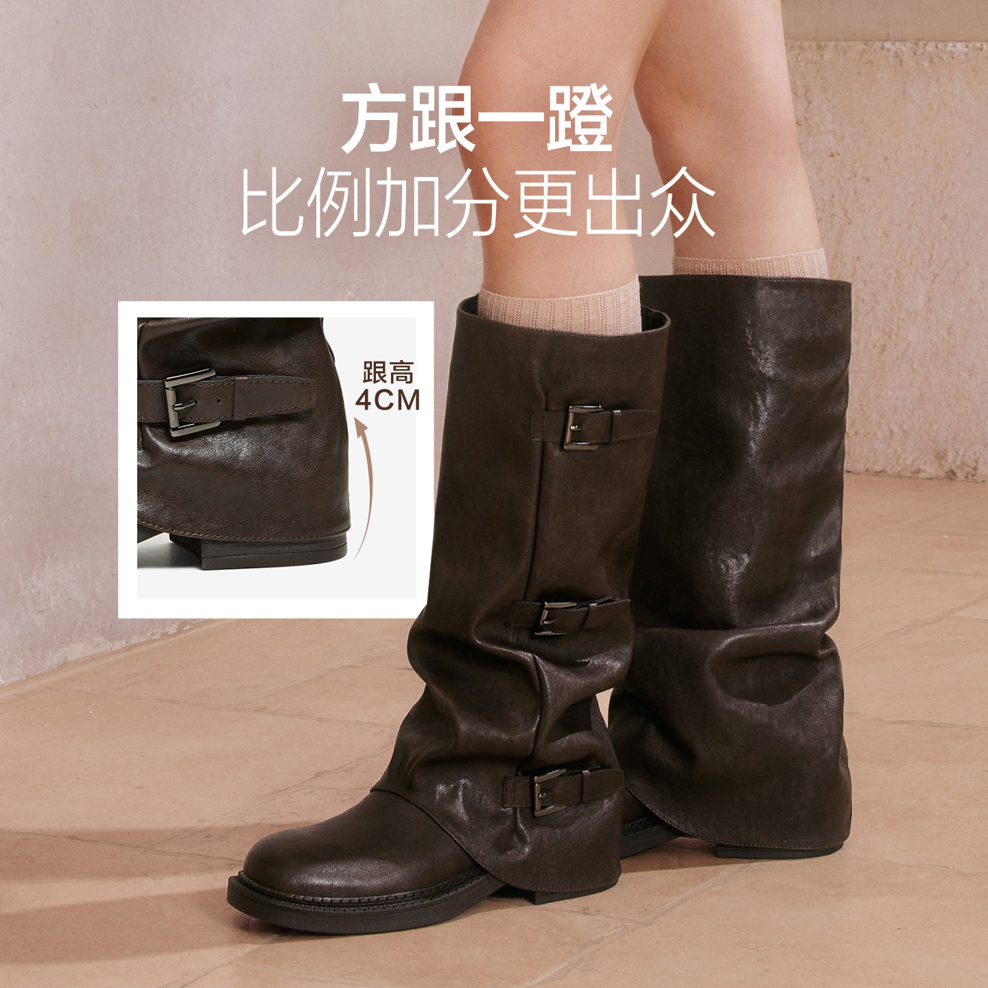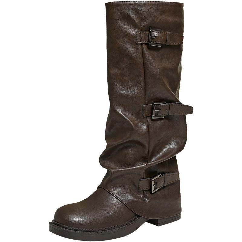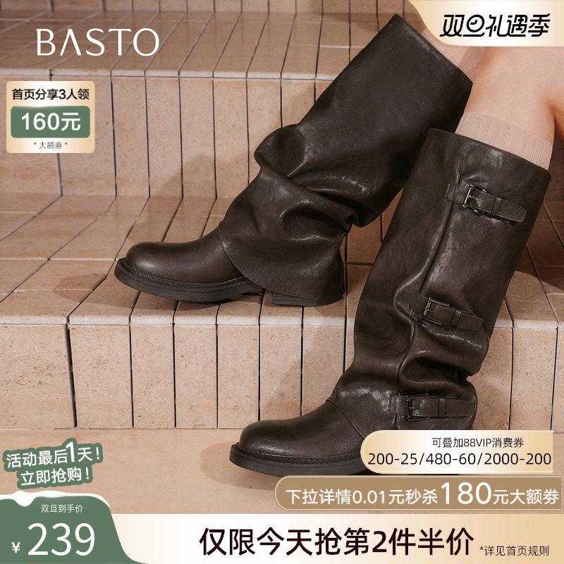 百思图2025冬新款棕色裤管靴大筒围骑士靴女高筒堆堆长靴B8605DG5
