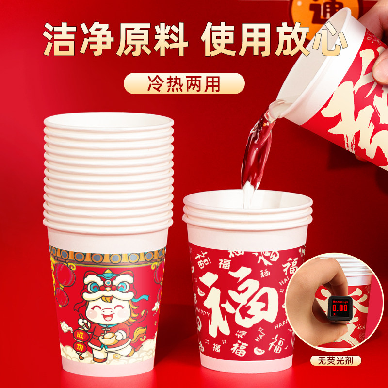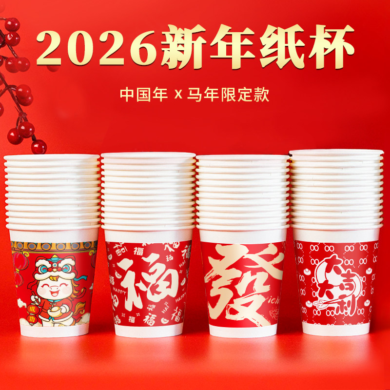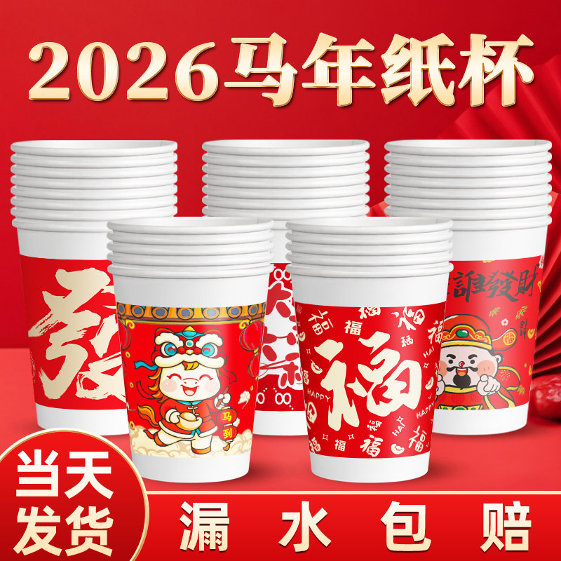 2026马年纸杯新年过年一次性杯子红色加厚纸杯子家用水杯年货批发
