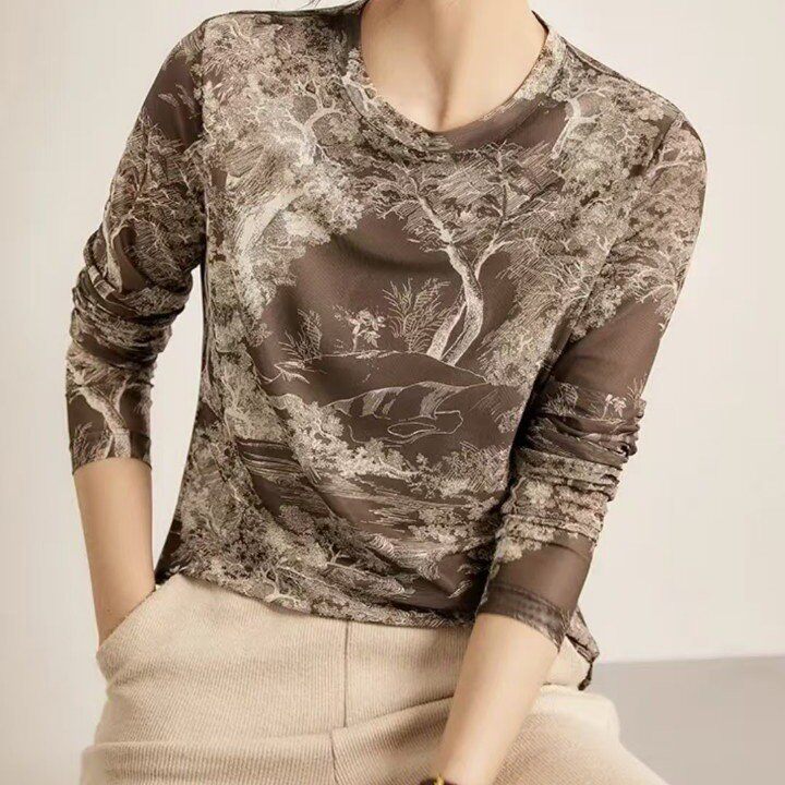 新款2025春秋水墨画印花网纱修身显瘦圆领T恤女内搭打底衫百搭