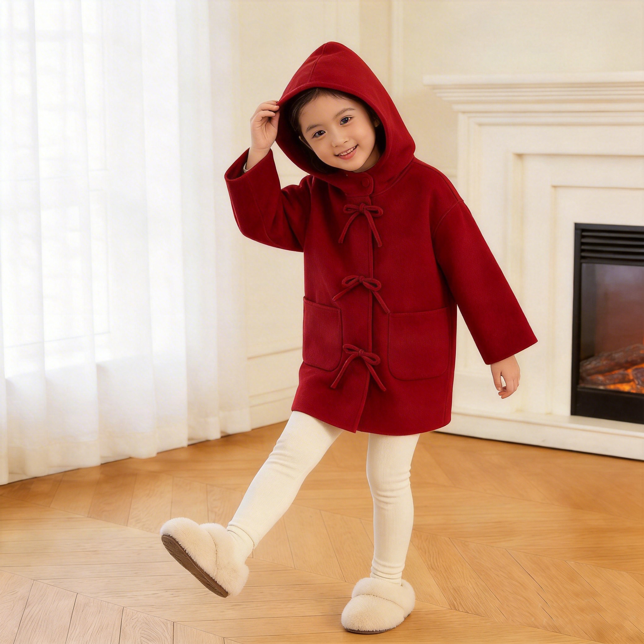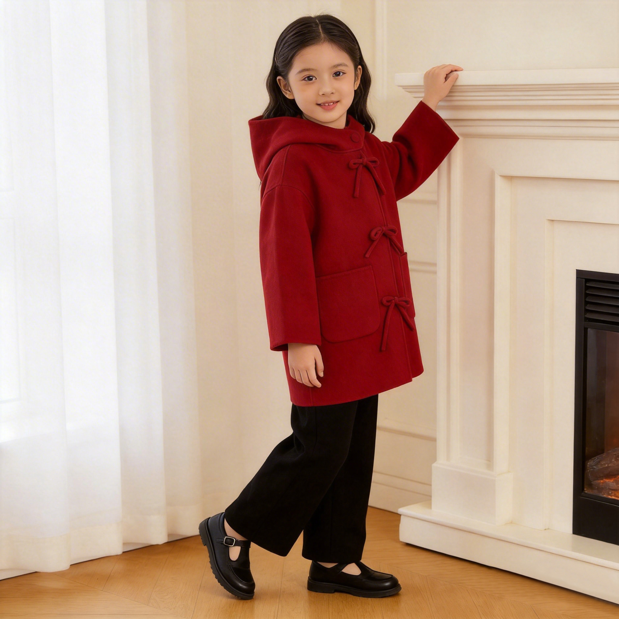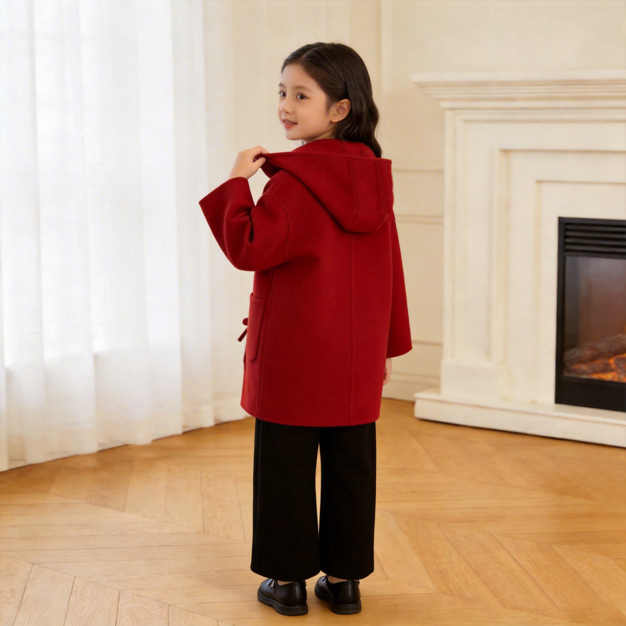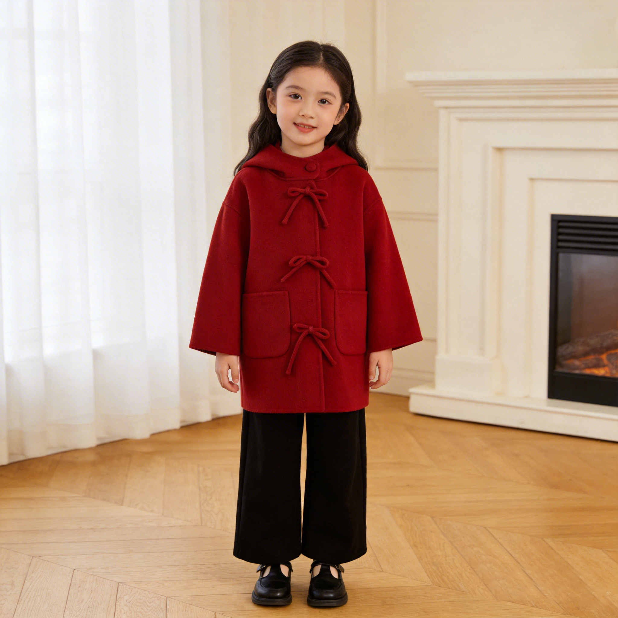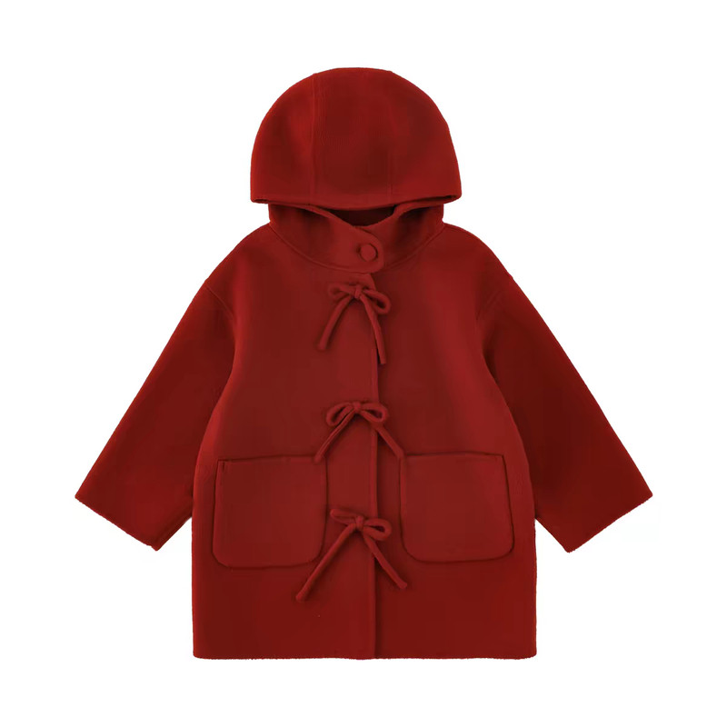 女童2026春新款中长款纯羊毛双面呢大衣新中式连帽儿童外套年服