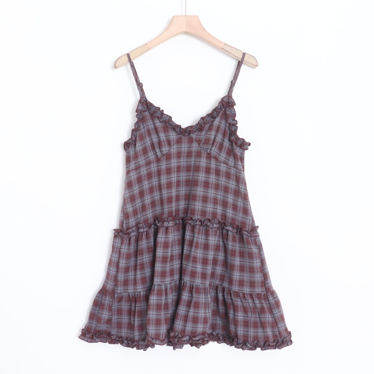 D05014日单新款客供料花边V领微宽松甜美女2Way格子可调节吊带裙