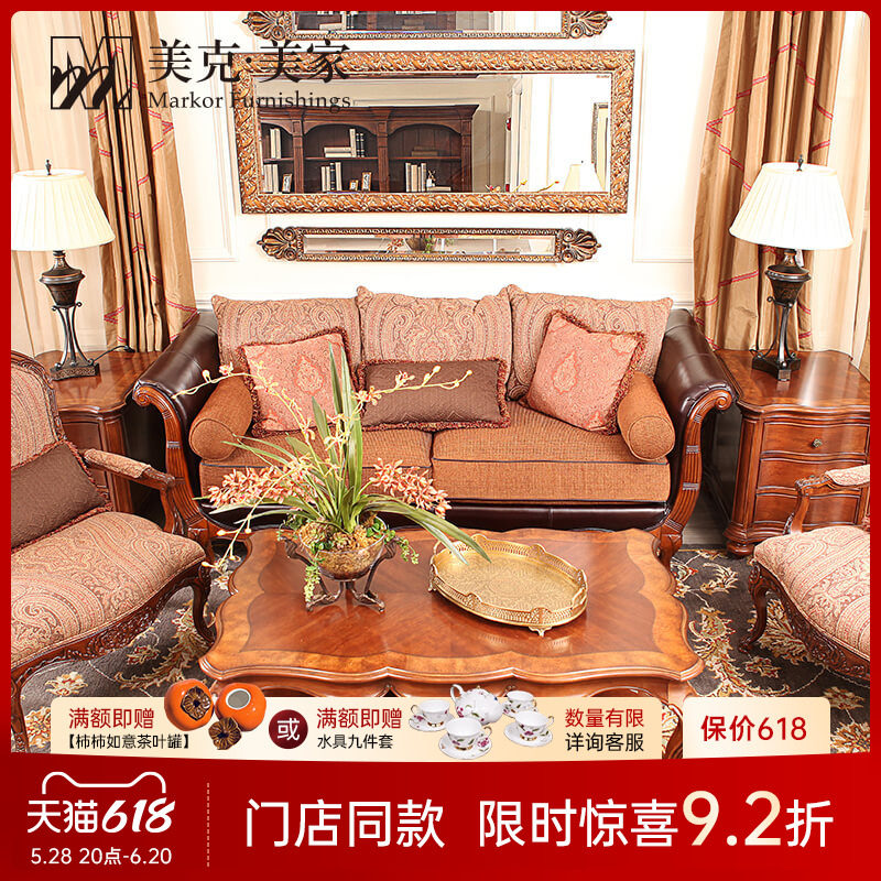 美克美家圣卡罗三人沙发 欧式古典皮布结合单人沙发带抱枕