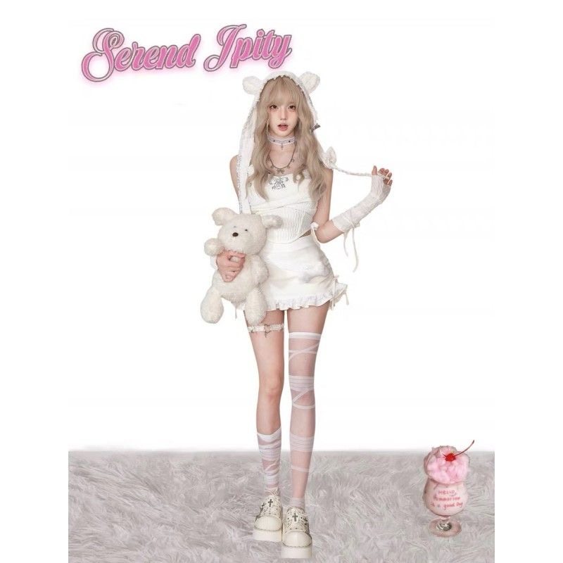 夏季甜美奶乖软妹风白色吊带背心+高腰包臀短裙+帽子袖套四件套女