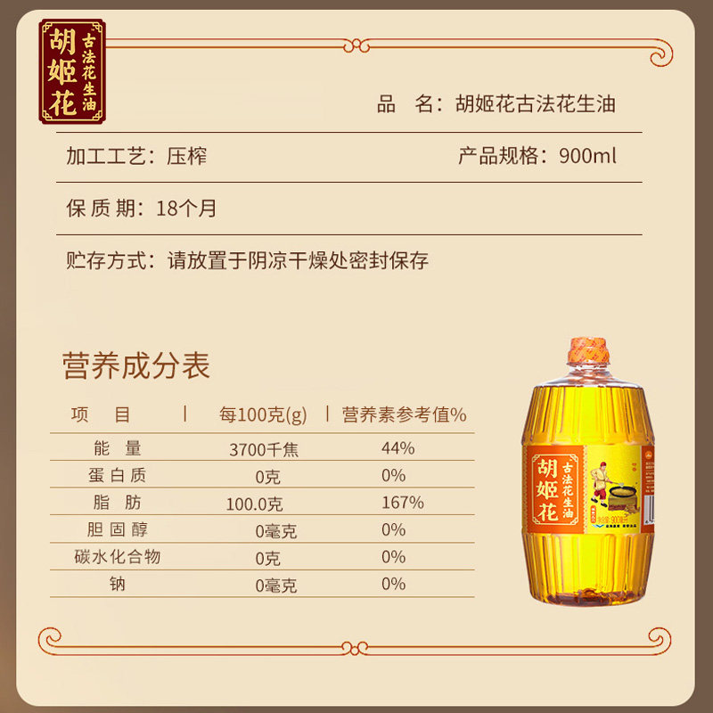 胡姬花古法花生油特香型900ml小瓶装 一级压榨炒菜山东花生食用油