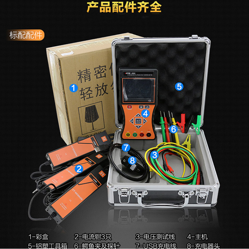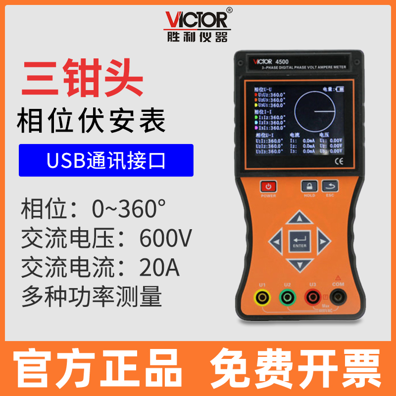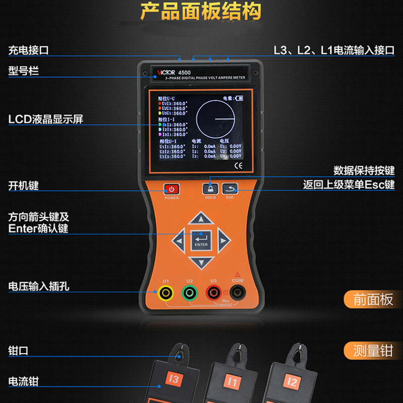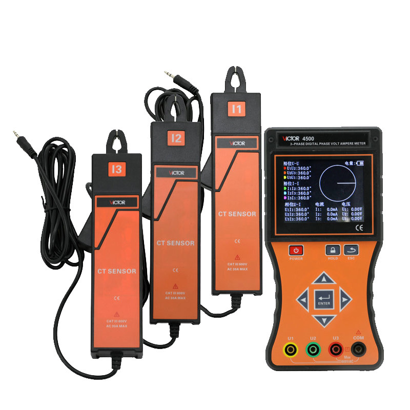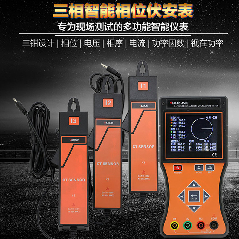 VICTOR胜利仪器VC4500三钳数字相位伏安表 三相相序检测仪相位表