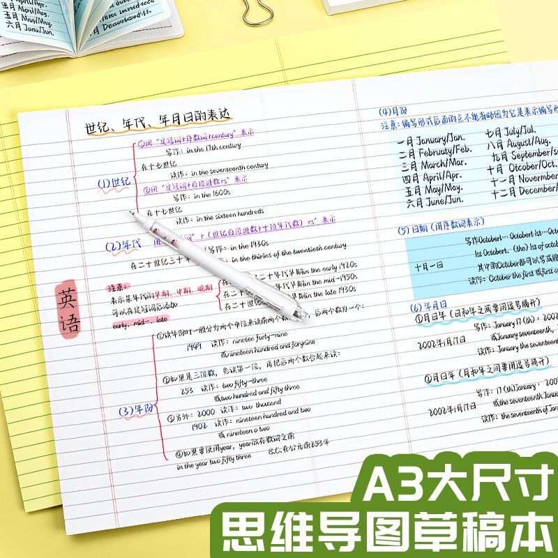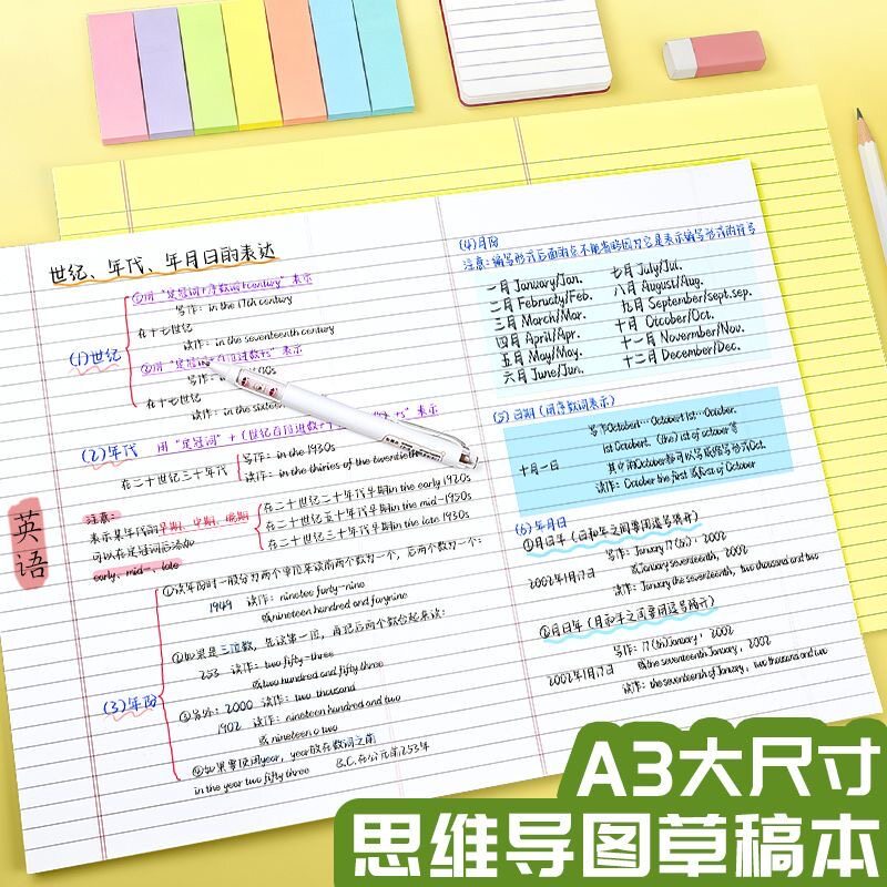 A3思维导图草稿纸拍纸本可撕横版美式试卷形刷题草稿本大尺寸书写规划本横线空白草稿纸考研用背单词复习背诵