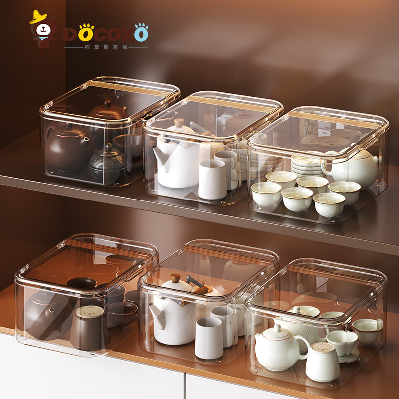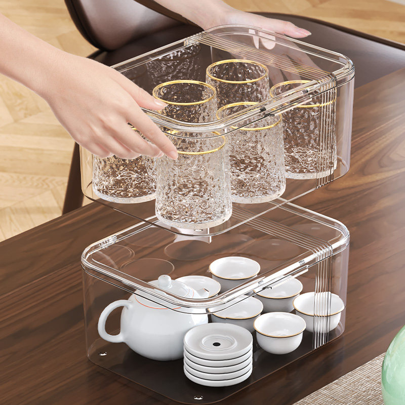 茶具收纳盒透明带盖防尘茶杯整理盒茶几桌面置物架茶壶茶杯展示盒