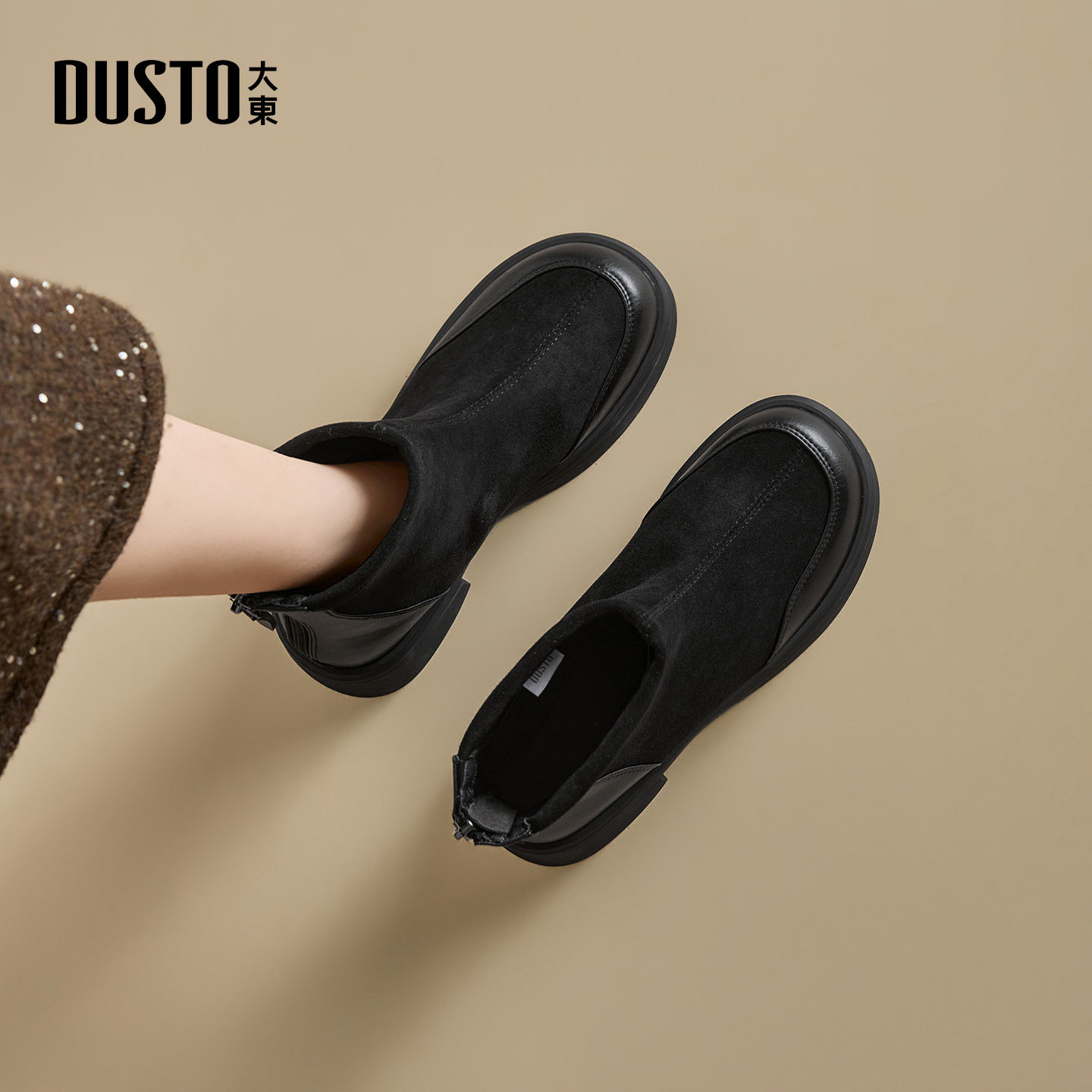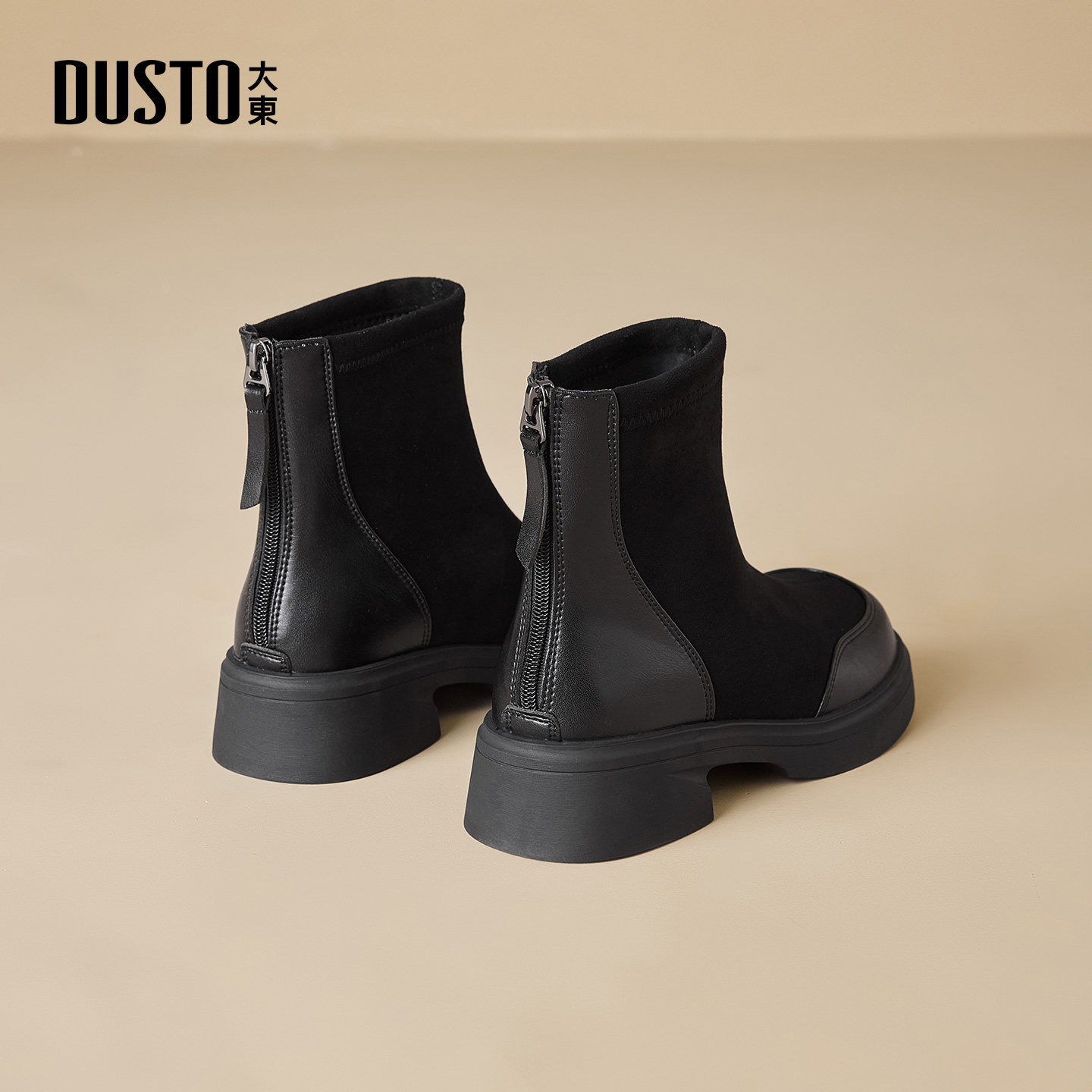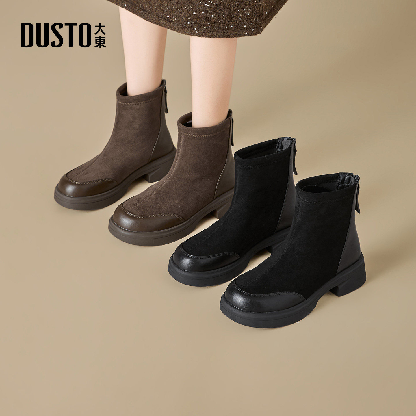 大东时装靴女鞋2025年冬季新款粗跟中跟后拉链圆头材质拼贴D1201