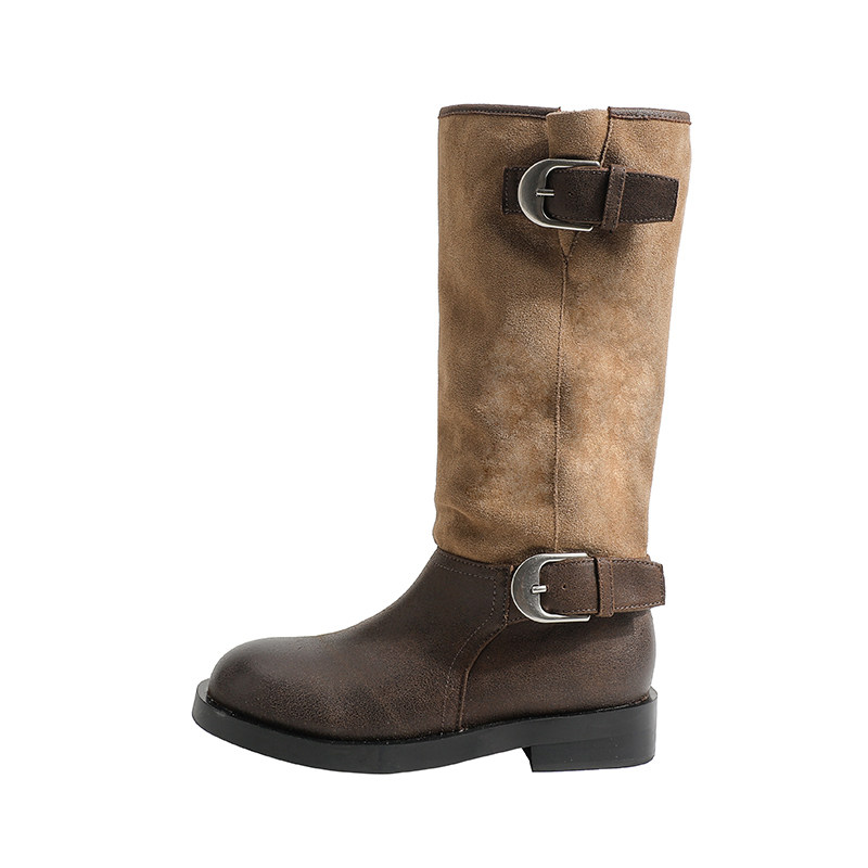 真皮~骄屿复古皮带扣中筒堆堆靴秋冬新款骑士靴粗跟不过膝长筒靴