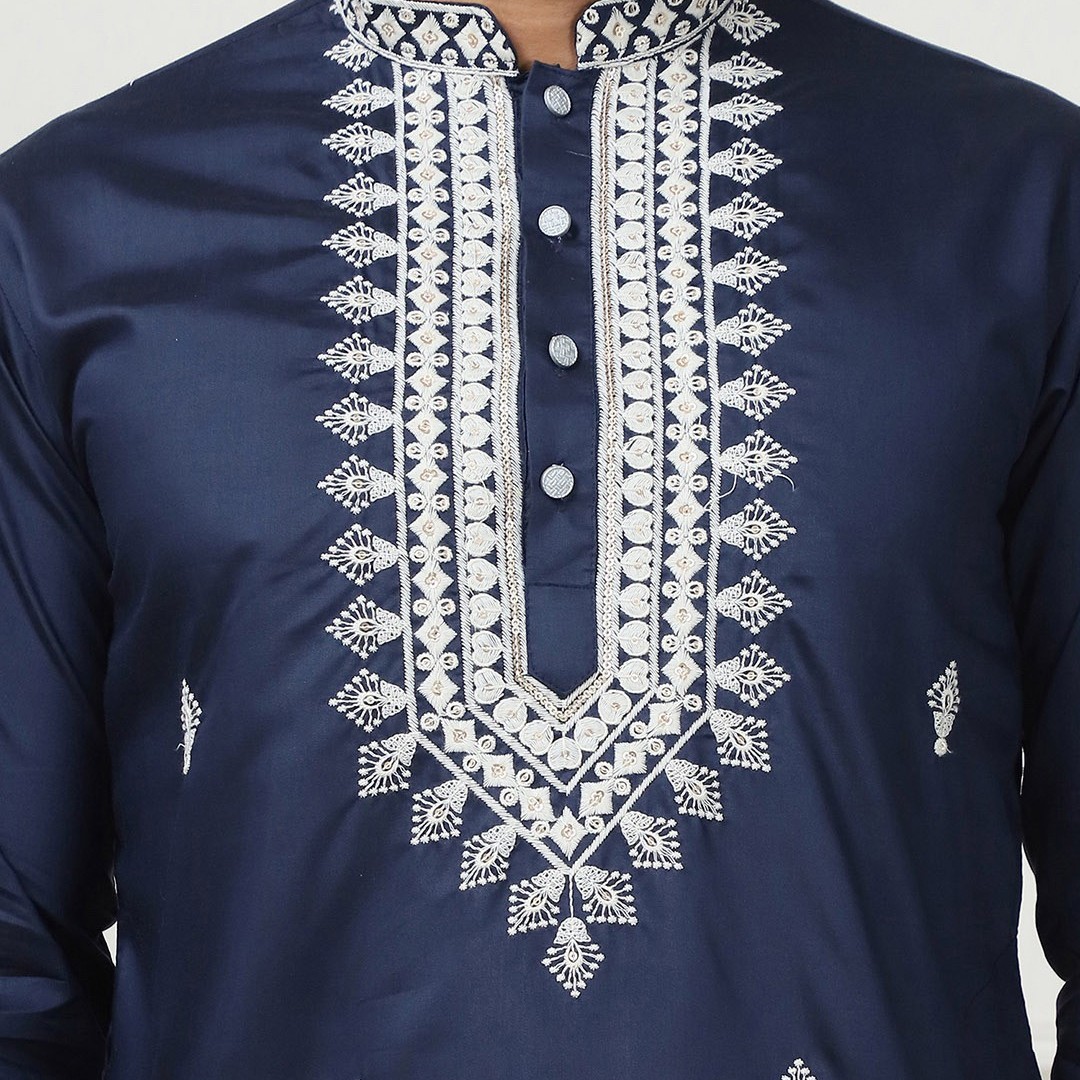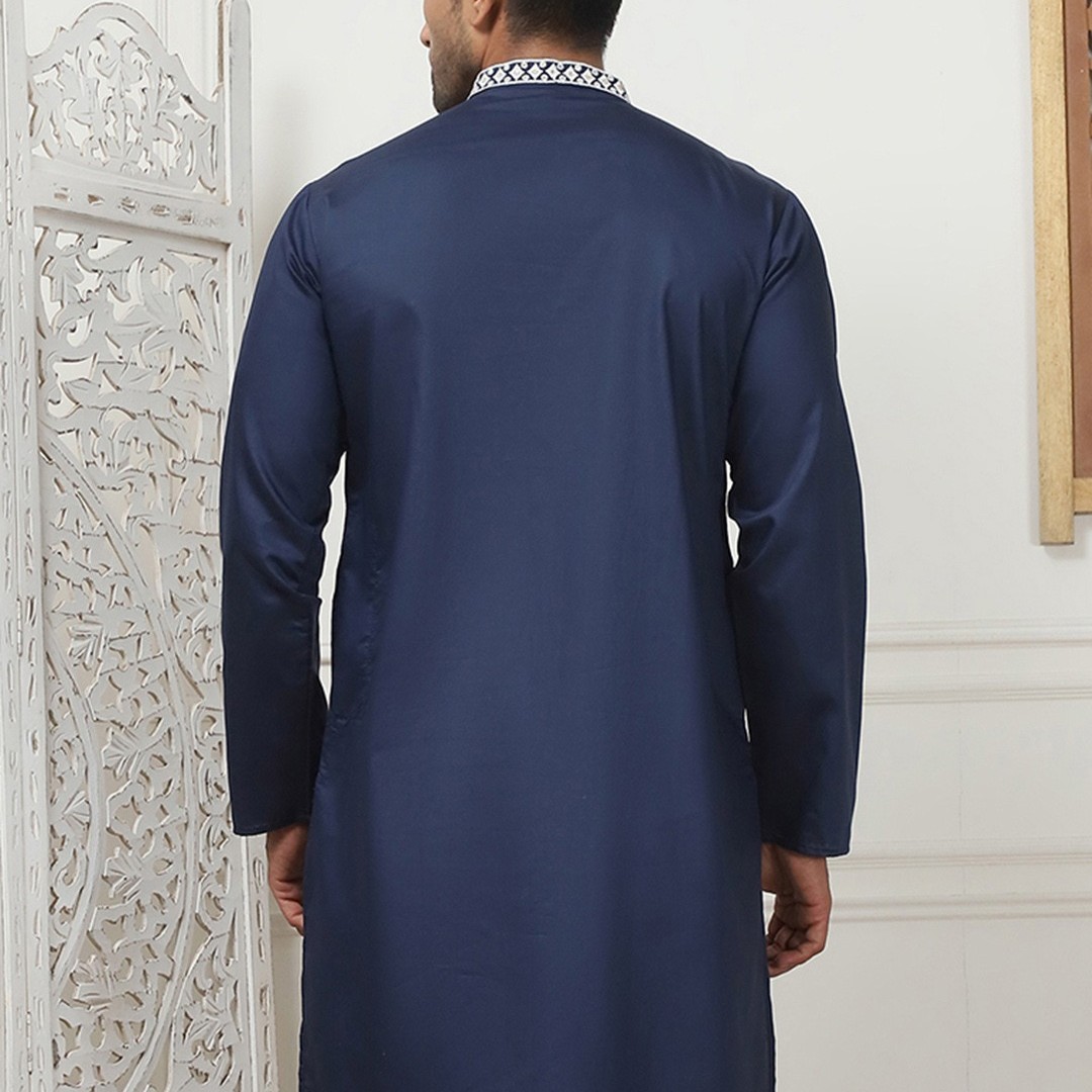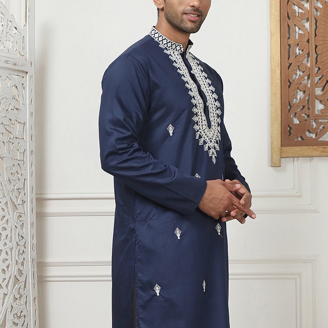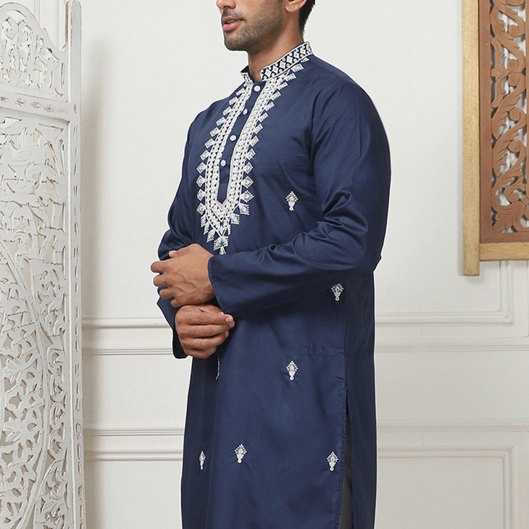 印度进口男装新款服饰民族风传统丝绵刺绣中长款上衣薄款深蓝色